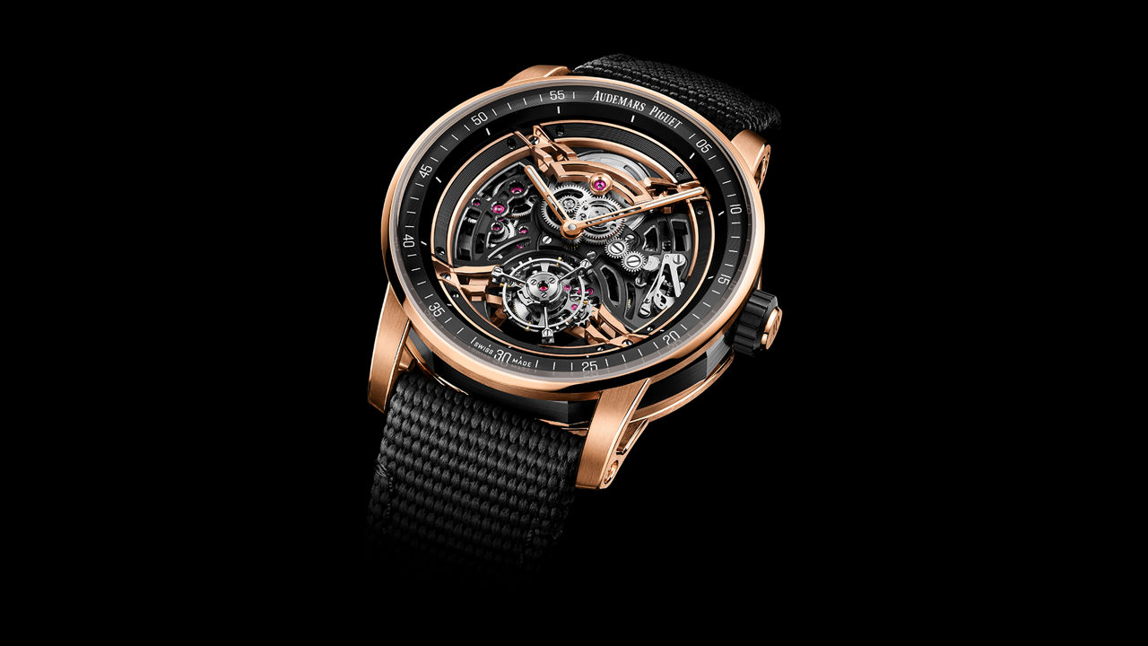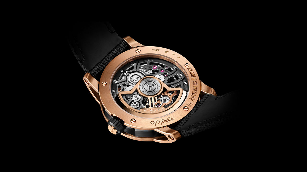 The black rubber-coated strap with calfskin lining is fitted with an 18-carat pink gold AP folding clasp.
