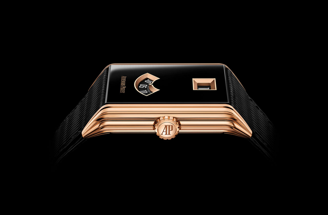 Inspired by the Streamline design movement, this refined watch debuts Audemars Piguet’s first selfwinding jumping hour movement, Calibre 7122. Its rectangular case in pink gold and sapphire blends horological innovation with vintage aesthetics, while the newly developed strap motif embodies the creative spirit that defines the Manufacture.