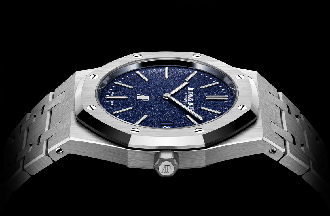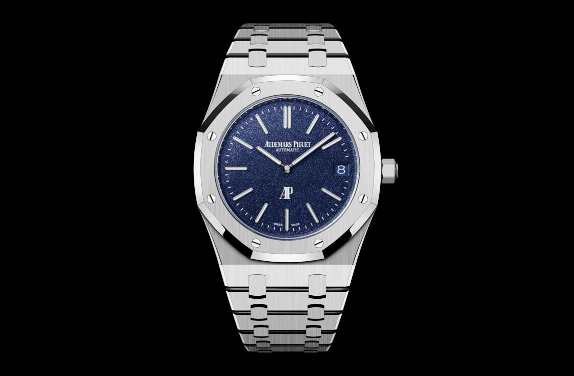 The introduction of a new grainy blue dial offers a new interpretation of the famous Royal Oak “Jumbo” model that is presented here in an extra-thin white gold case.