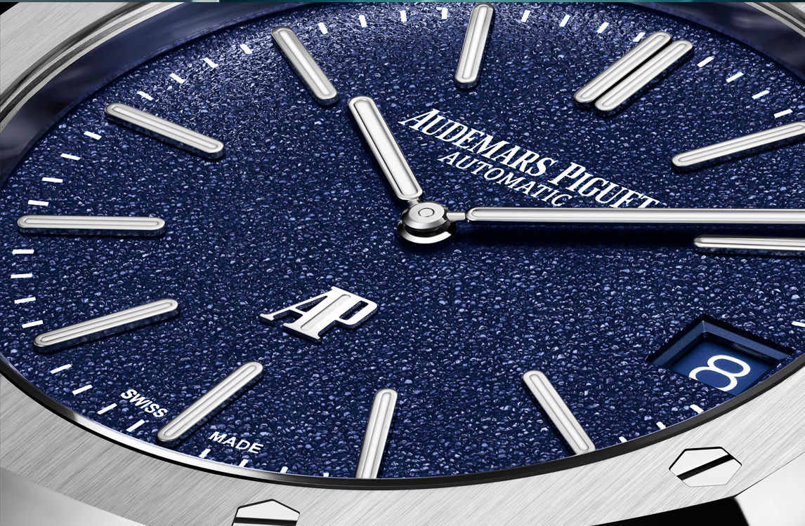 Blue dial with “grainy effect”, white gold applied hour-markers and Royal Oak hands with luminescent coating.