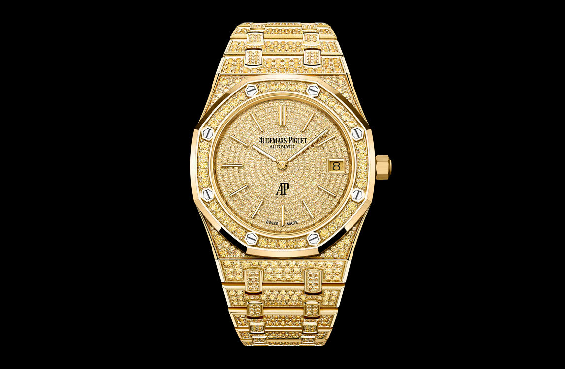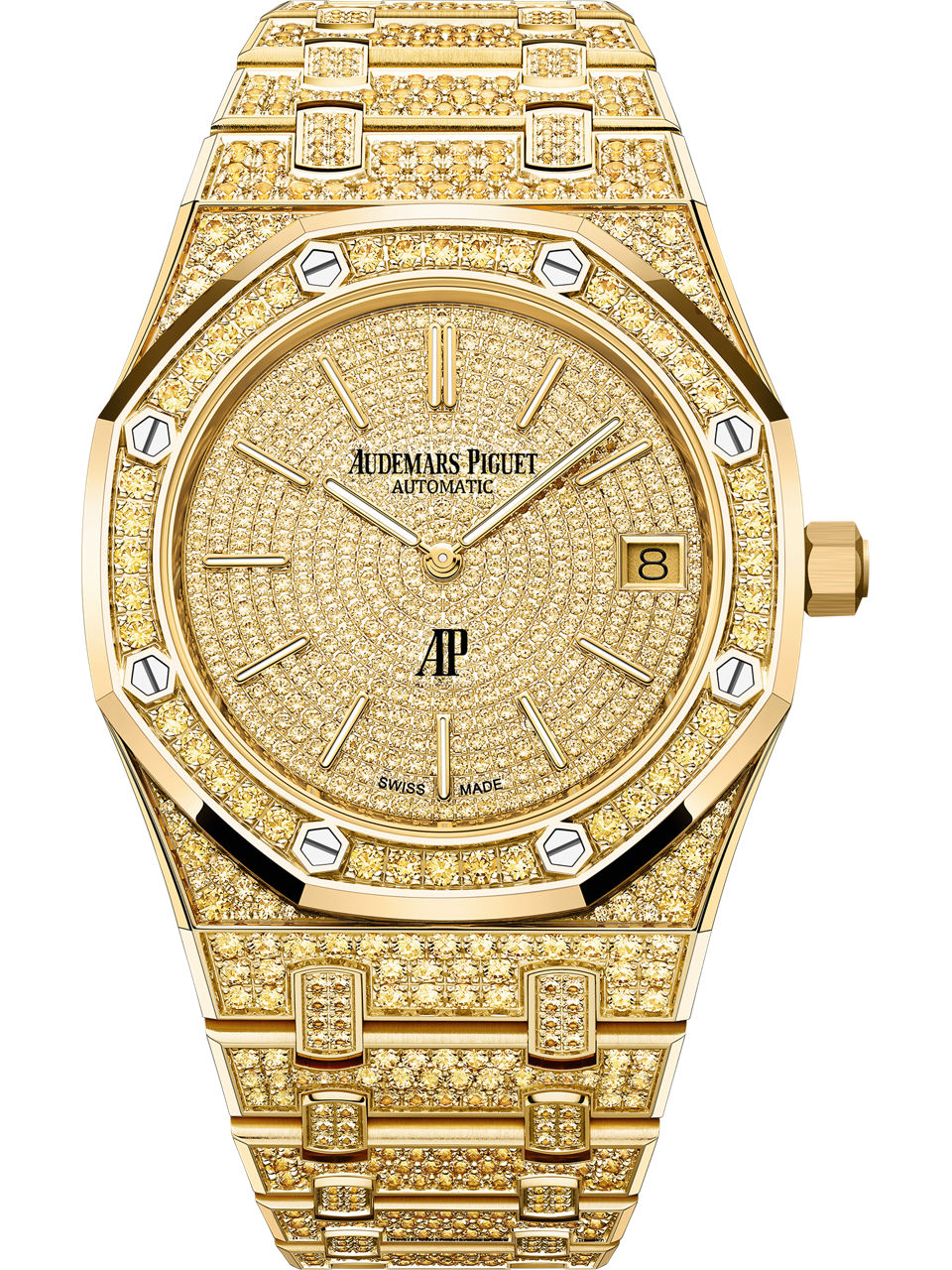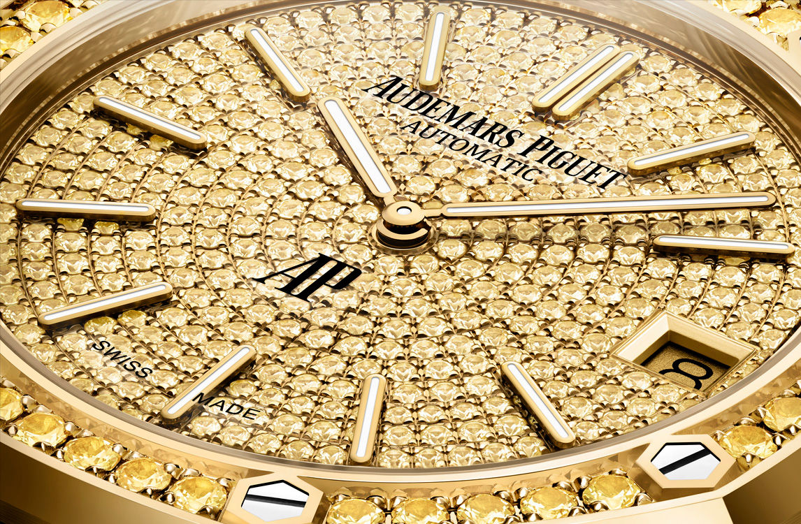 18-carat yellow gold dial set with brilliant-cut yellow sapphires, yellow gold applied hour-markers, yellow gold Royal Oak hands with luminescent coating.