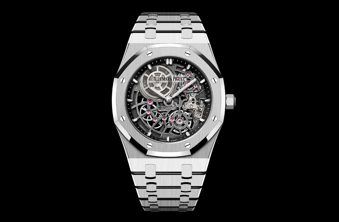 Openworked dark grey movement, white gold applied hour-markers and Royal Oak hands with luminescent coating.