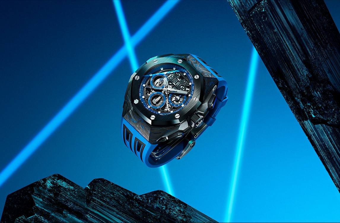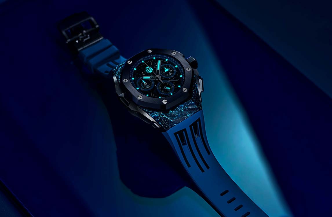 This highly complicated timepiece introduces a patented Chroma Forged Technology carbon case with touches of blue glowing in the dark, complemented by a black ceramic bezel. The openworked dial and interchangeable rubber strap combine black and blue for a high-tech two-tone design.