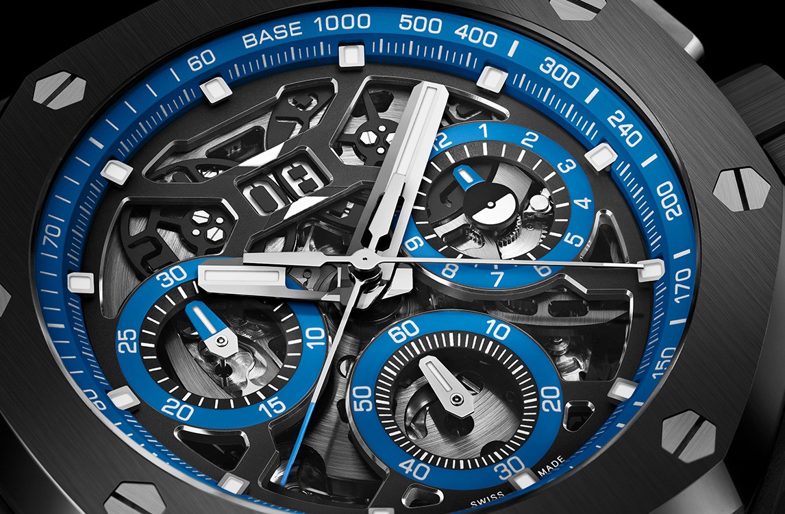 Openworked dial, black counters with blue external zone, white gold hour-markers and hands with luminescent coating, titanium chronograph and split-second hands, blue inner bezel.