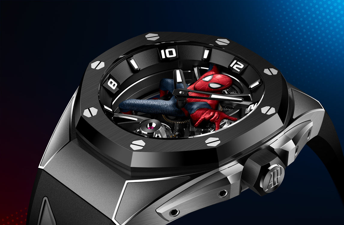 Openworked dial with "Spider-Man" figure, white gold hour-markers and hands with luminescent coating.
