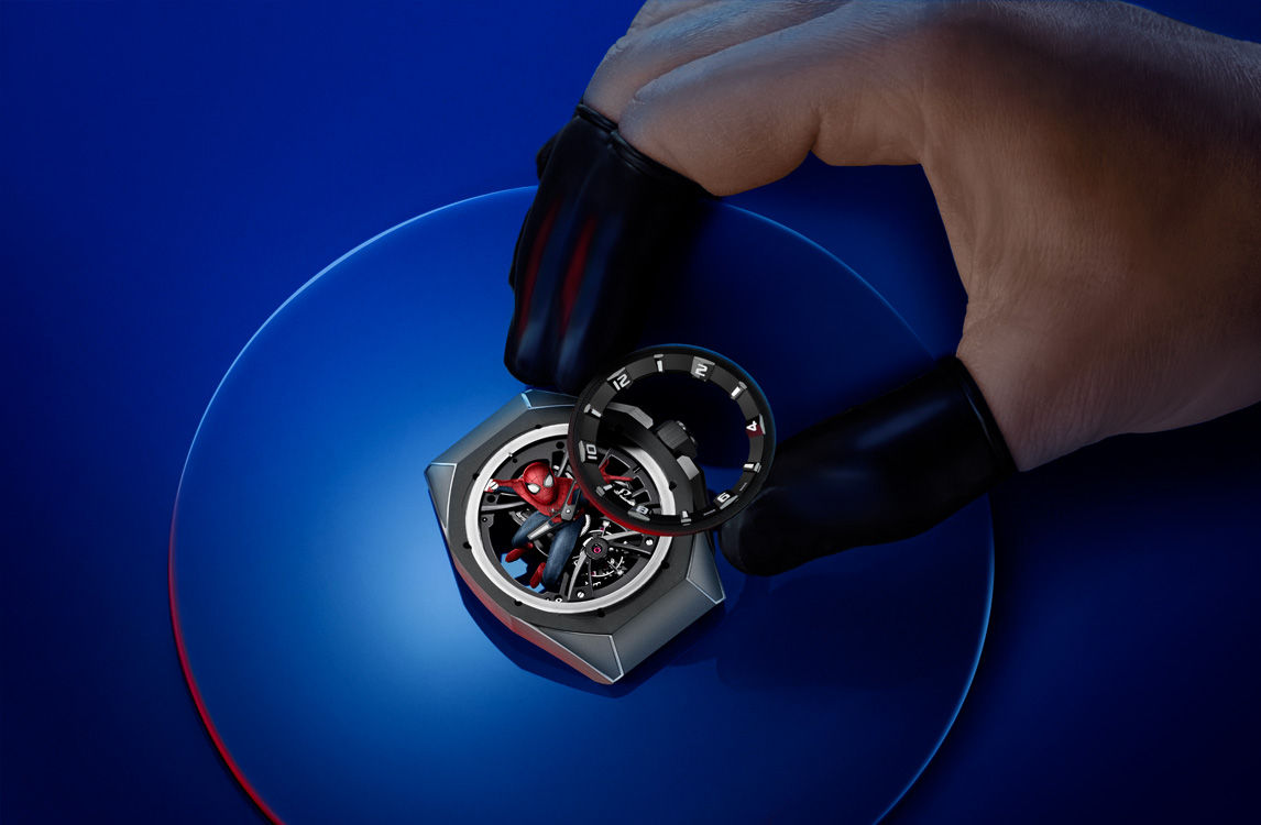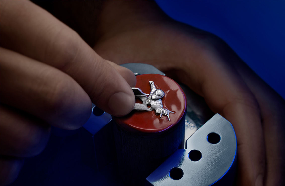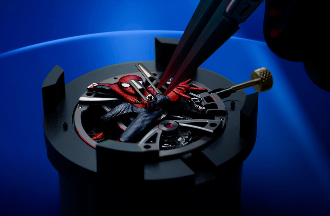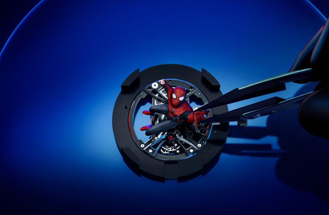 A feat of skeletonization, this second Marvel collaboration pays tribute to Spider-Man, who appears to be suspended from the dial as he passes through the tourbillon mechanism.