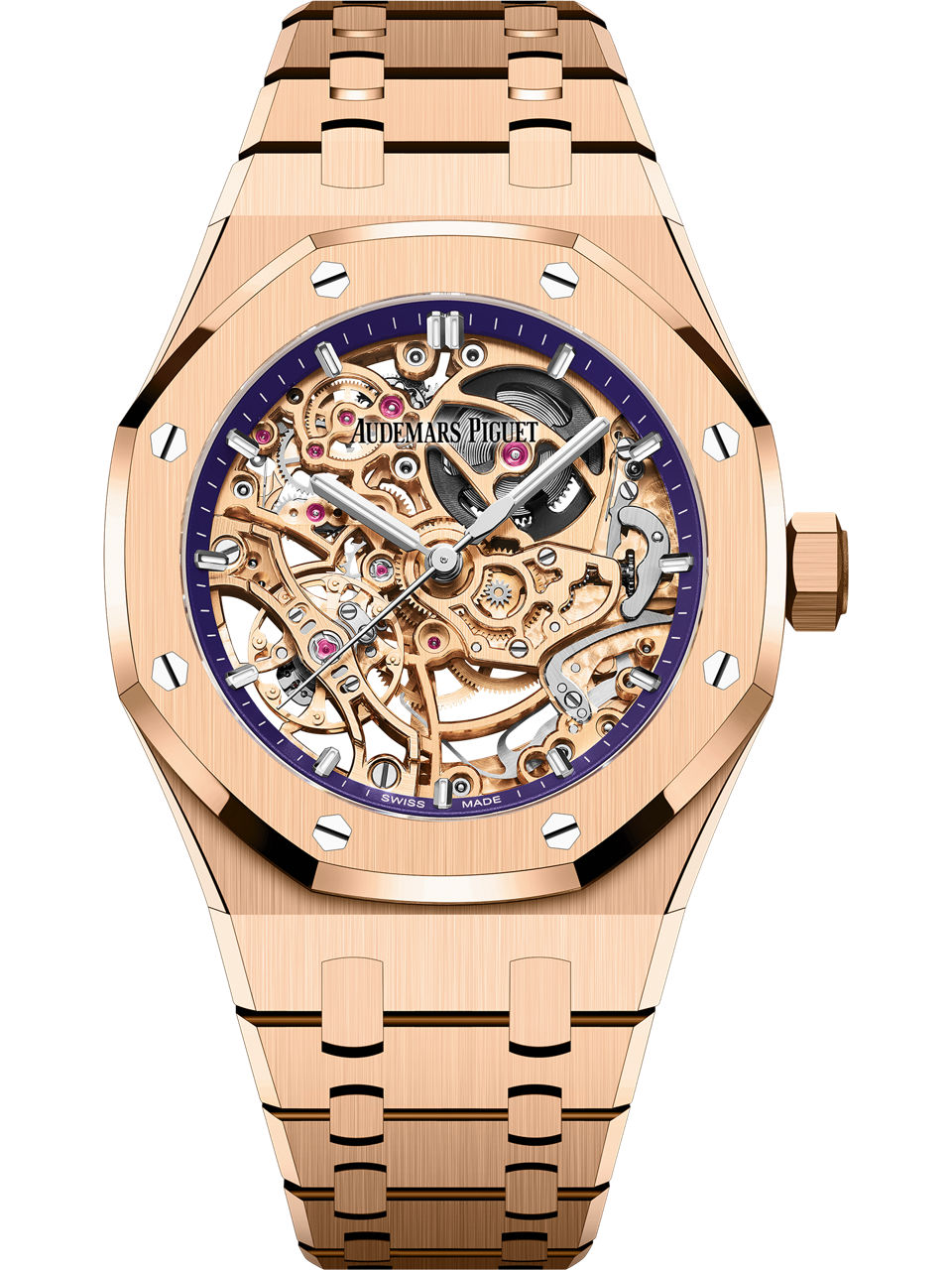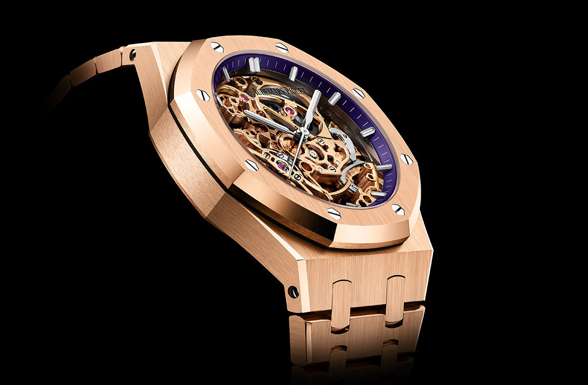Purple inner bezel, white gold applied hour-markers and Royal Oak hands with luminescent coating.