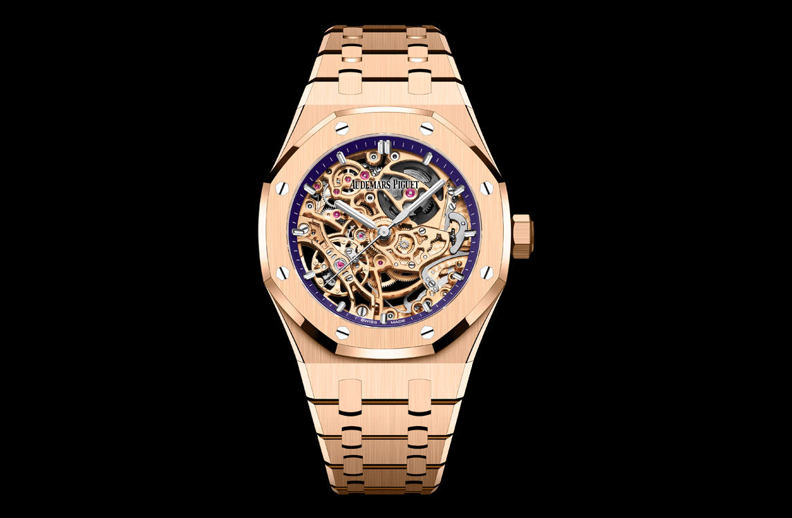 This 37 mm timepiece combines an 18-carat pink gold case and bracelet with a matching pink-gold-toned openworked movement, revealing the double balance wheel mechanism on either side of the watch. The purple inner bezel adds a touch of colour.