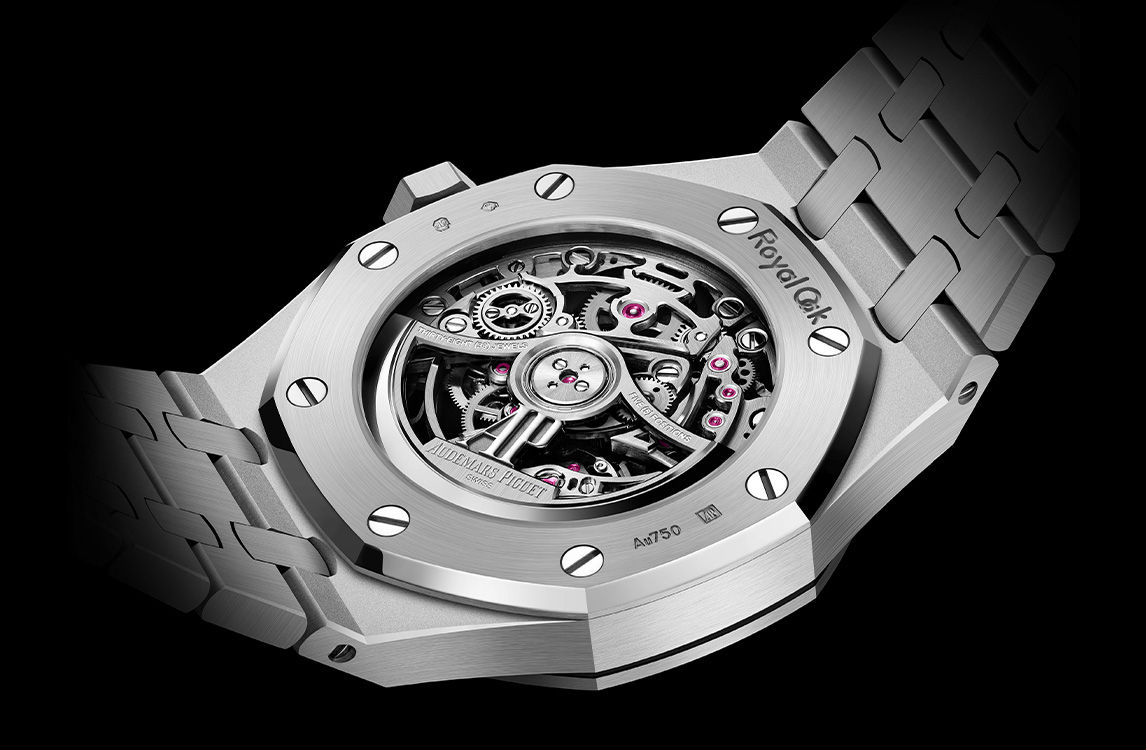 This 37 mm Royal Oak Double Balance Wheel Openworked model in 18-carat white gold features a tone-on-tone openworked movement and a light blue inner bezel for a subtle and elegant contrast.
