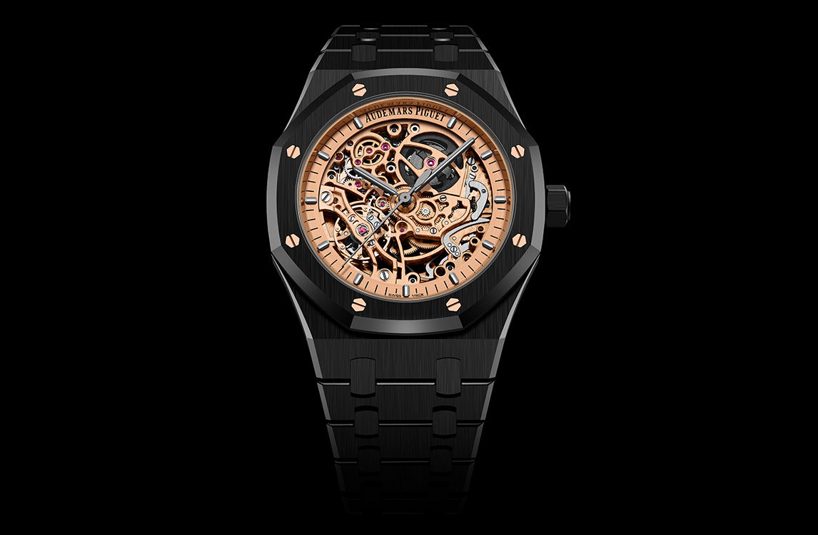 Pink gold-toned inner bezel, blackened rhodium applied hour-markers and Royal Oak hands with luminescent coating.