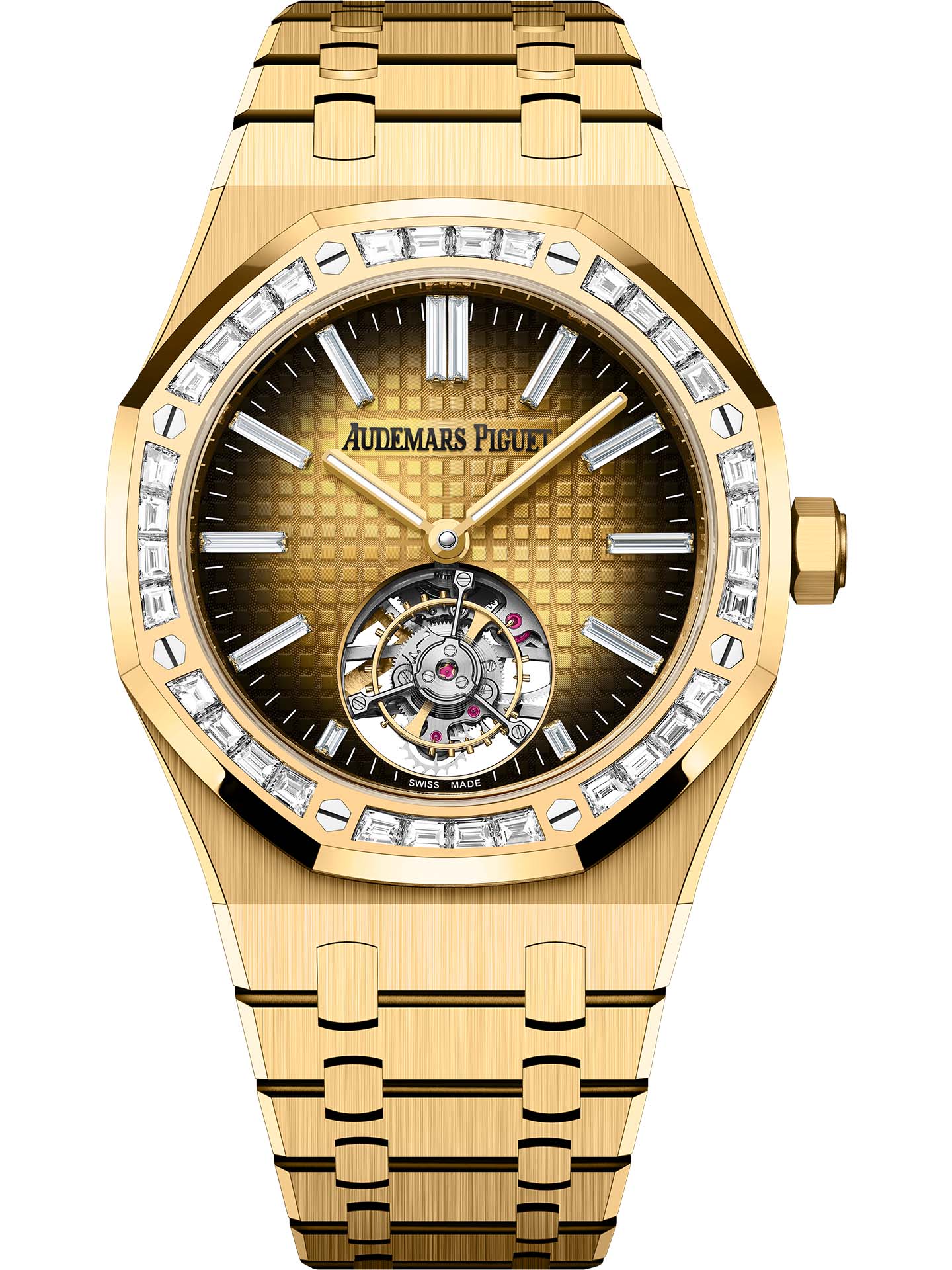 Smoked yellow gold-toned dial with “Grande Tapisserie” pattern, baguette-cut diamond hour-markers, yellow gold Royal Oak hands with luminescent coating.