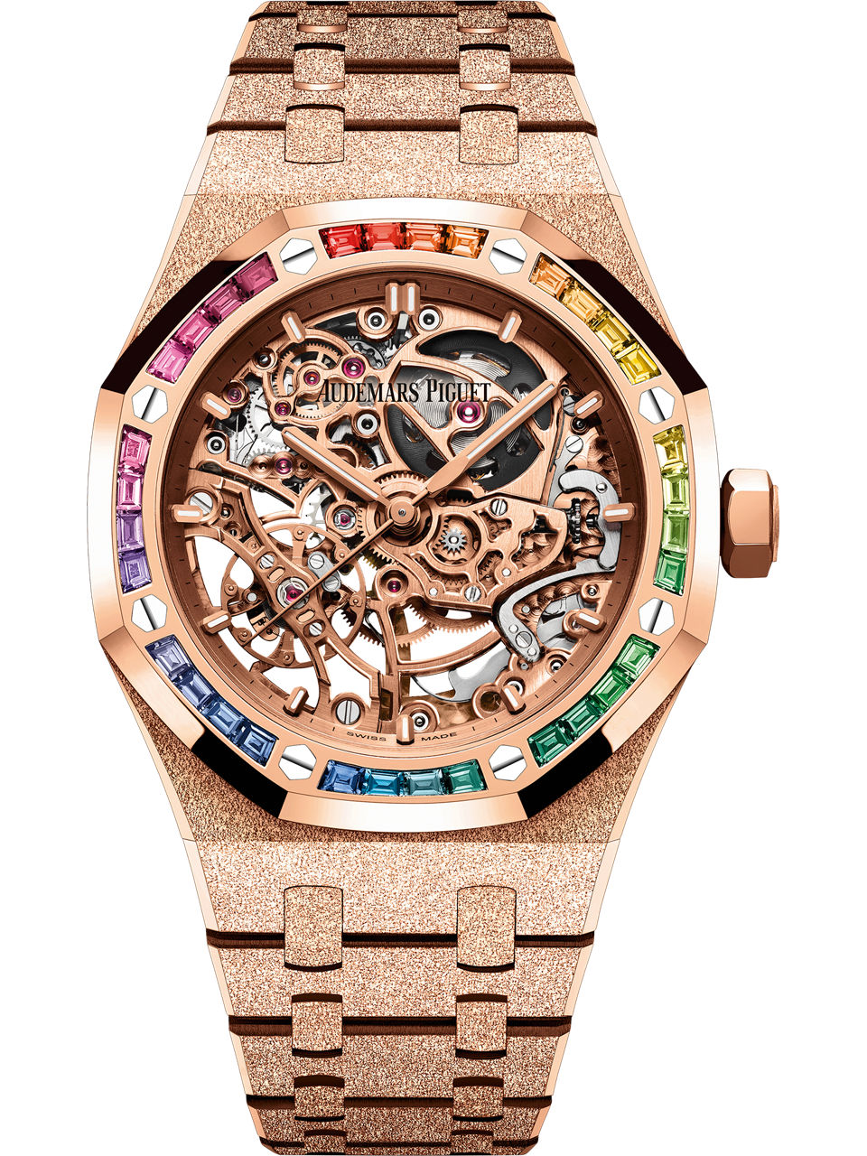 The 18-carat Frosted pink gold case and bracelet are enriched with a rainbow bezel composed of multicoloured gemstones. The pink gold-toned openworked movement reveals the patented double balance wheel mechanism on both sides of the watch.