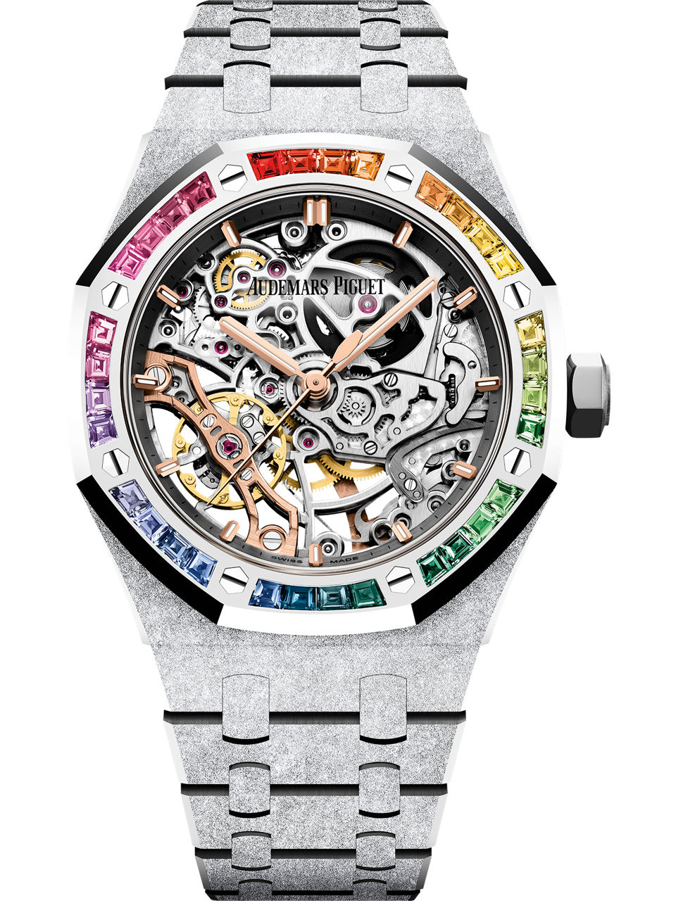 The shimmering 18-carat Frosted Gold case and bracelet are enhanced by a bezel set with 32 baguette-cut rainbow-coloured sapphires (2.24 carats), all individually cut.