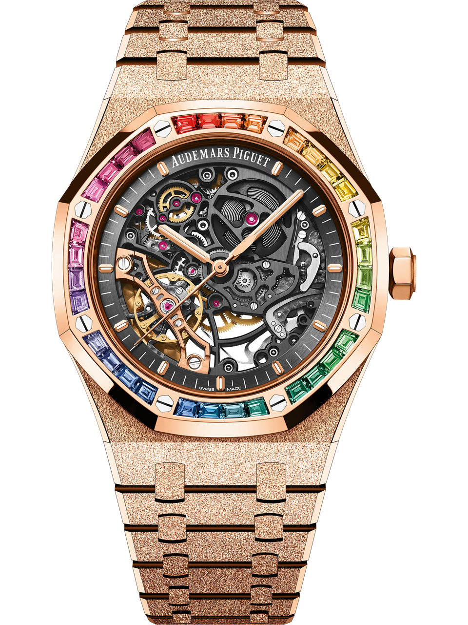 The 41 mm pink gold case and bracelet are finished with Frosted Gold while the bezel is set with baguette-cut multicoloured gemstones. The rainbow they create illuminates the openworked slate grey movement.