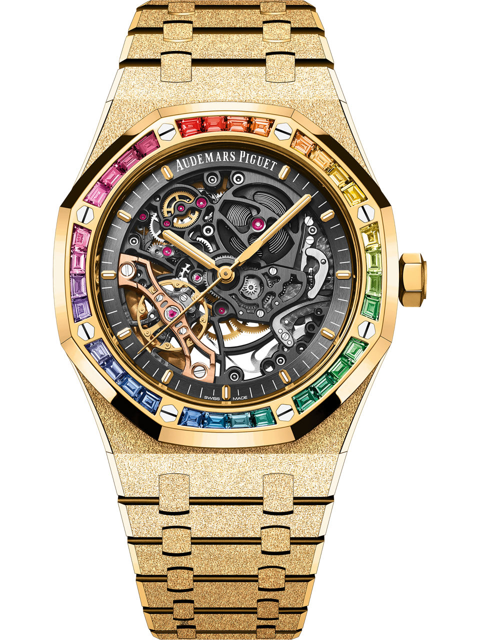 The 18-carat yellow Frosted gold case and bracelet powerfully contrast with the slate grey openworked movement. The rainbow bezel set with multicoloured gemstones adds a play of light.