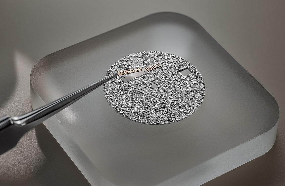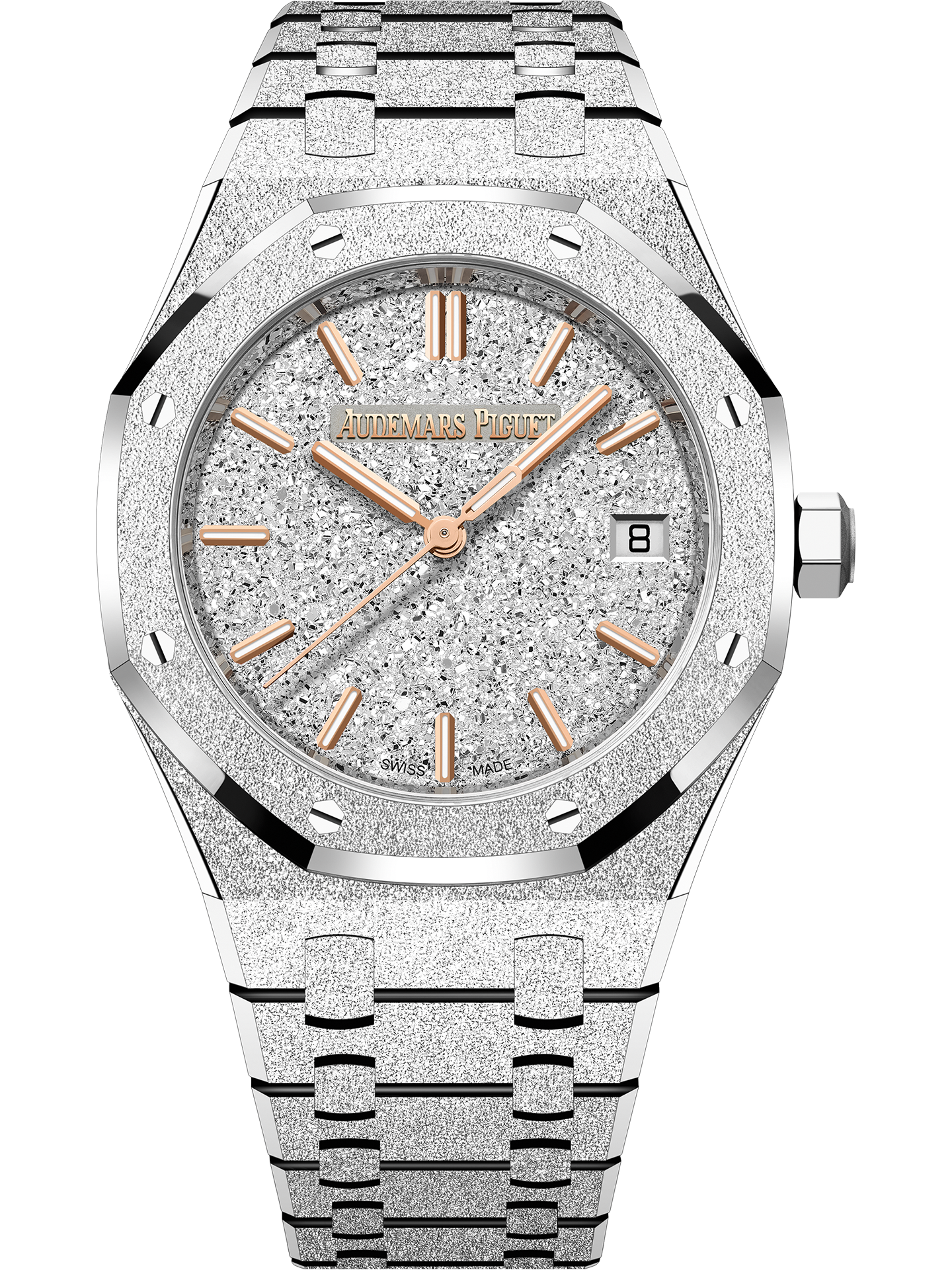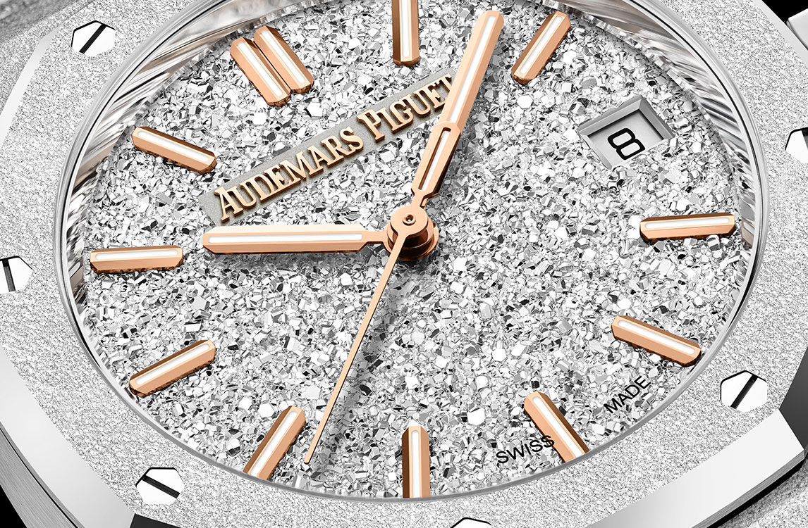 Rhodium-plated crystal sand finished dial, pink gold applied hour-markers and Royal Oak hands with luminescent coating.
