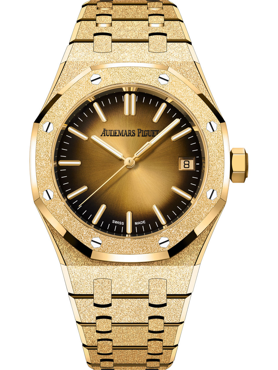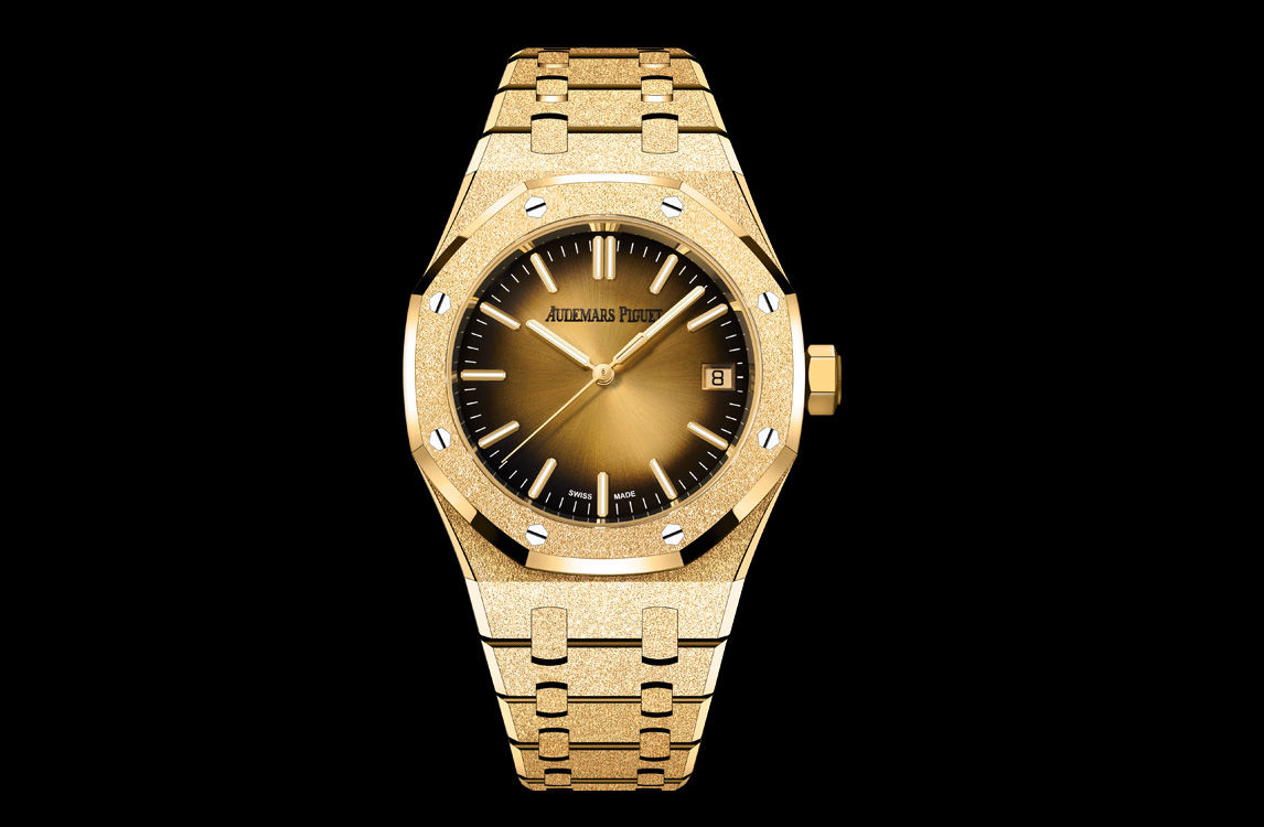 Smoked yellow gold-toned dial with sunburst effect, yellow gold applied hour-markers and Royal Oak hands with luminescent coating.