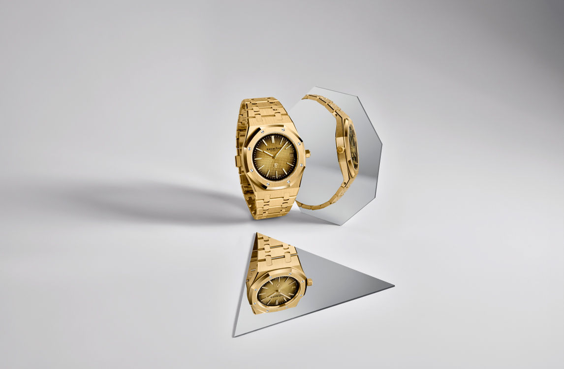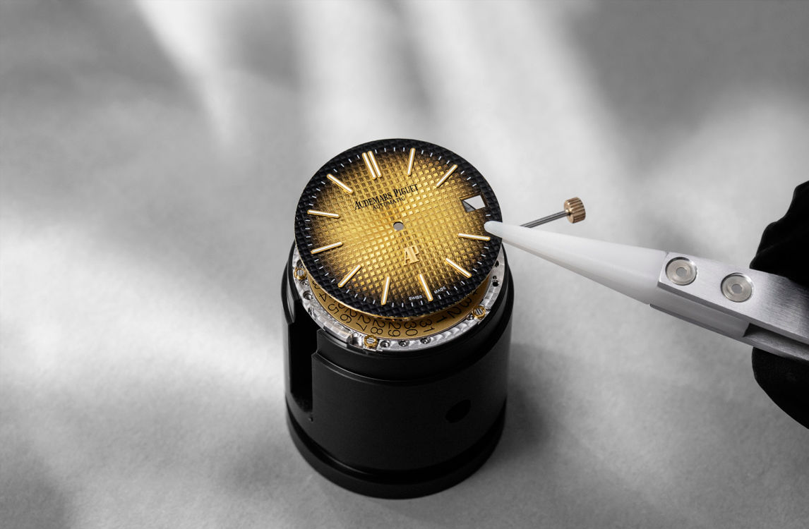Smoked yellow gold-toned dial with “Petite Tapisserie” pattern, yellow gold applied hour-markers and Royal Oak hands with luminescent coating.