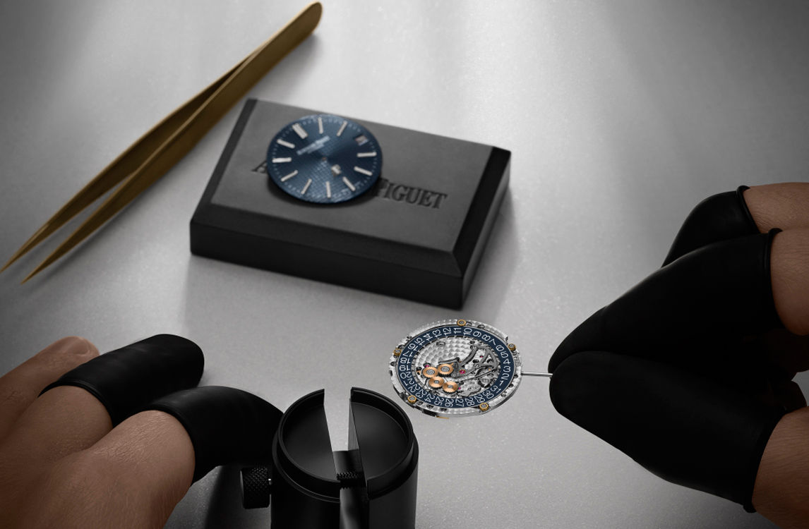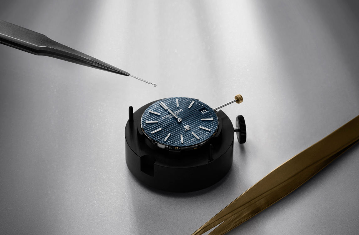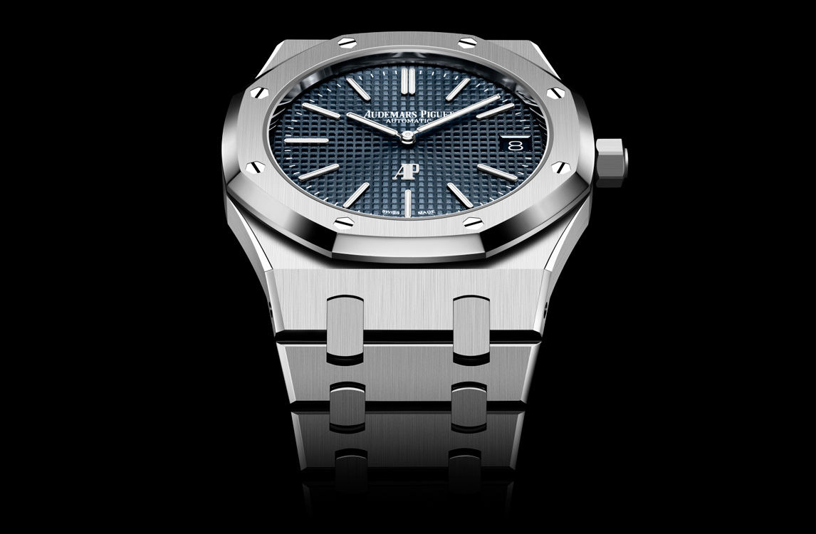 “Bleu nuit nuage 50” dial with “Petite Tapisserie” pattern, white gold applied hour-markers and Royal Oak hands with luminescent coating.