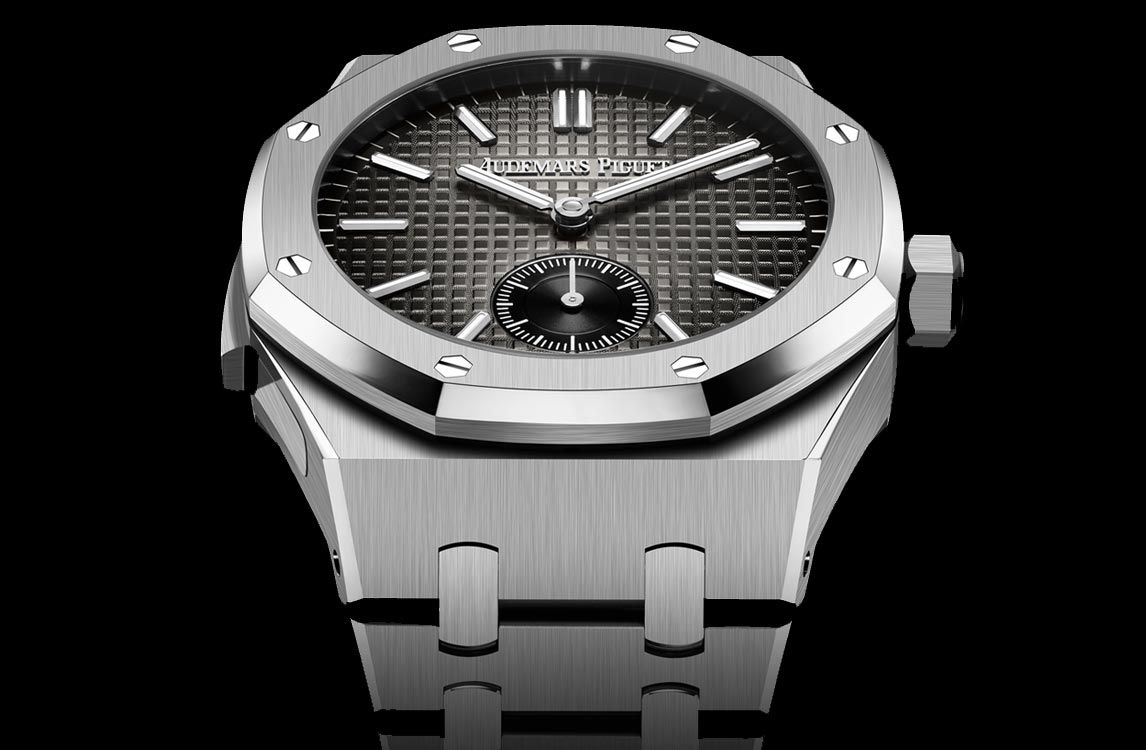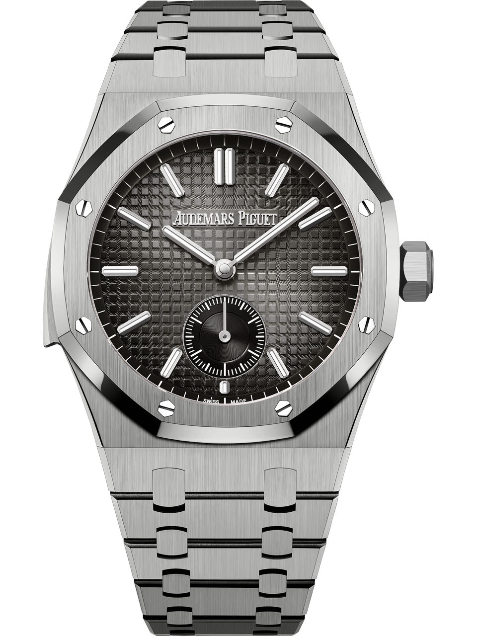 Smoked grey dial with “Grande Tapisserie” pattern, white gold applied hour-markers and Royal Oak hands with luminescent coating.