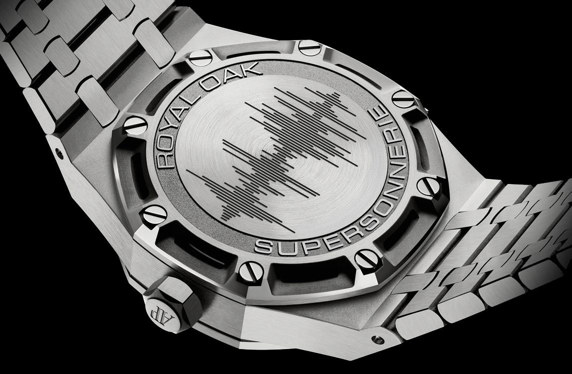 The Royal Oak Minute Repeater Supersonnerie offers an elegant contrast with its titanium case and bracelet enhanced with a smoked grey “Grande Tapisserie” dial.