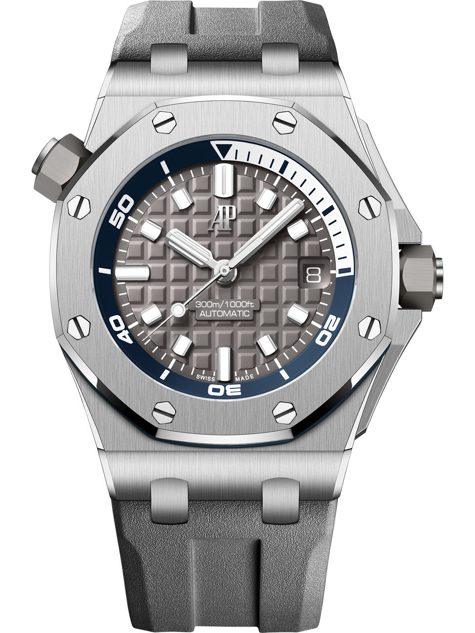 Grey dial with “Méga Tapisserie” pattern, white gold applied hour-markers and Royal Oak hands with luminescent coating, blue rotating inner bezel with zone from 60 to 15 minutes in white