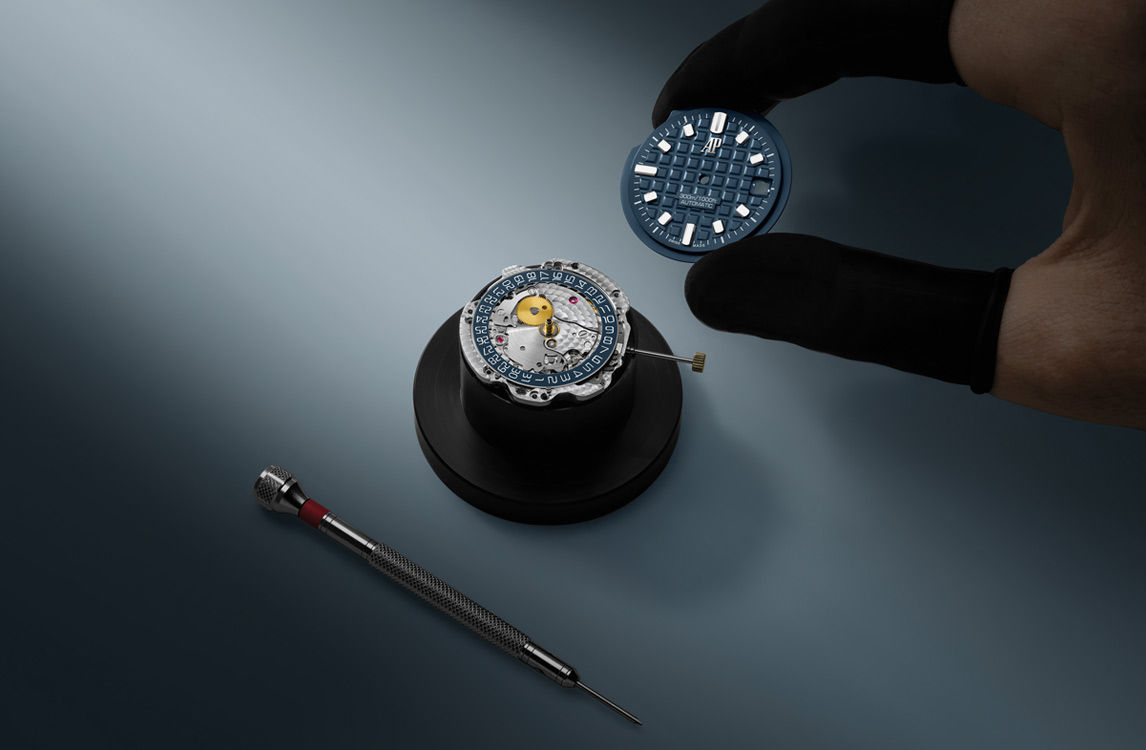 Blue dial with “Méga Tapisserie” pattern, white gold applied hour-markers and Royal Oak hands with luminescent coating, black rotating inner bezel with zone from 60 to 15 minutes in white