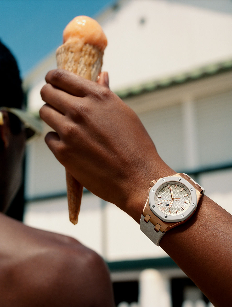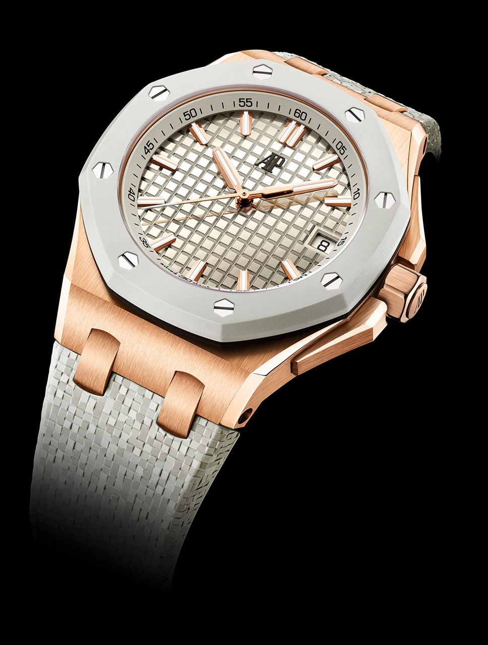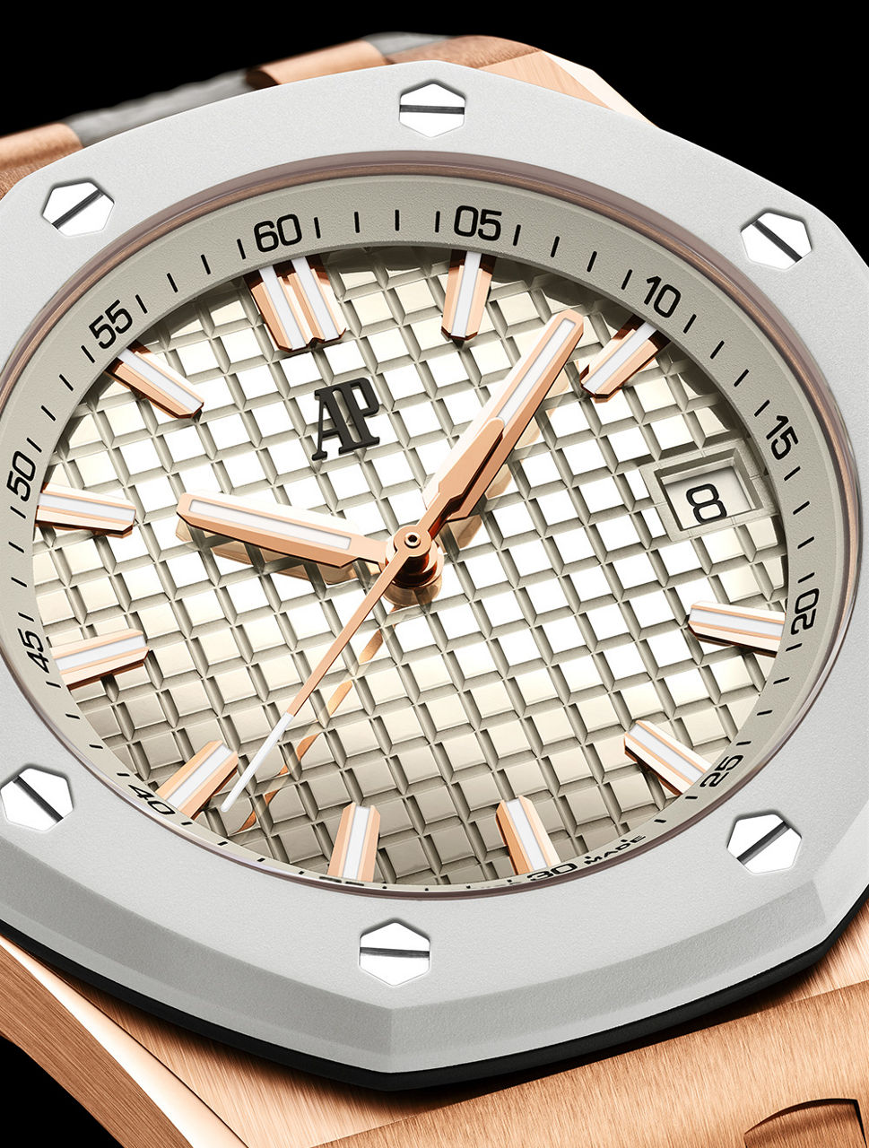 Ivory guilloché mirror-polished dial with “Grande Tapisserie” pattern, pink gold applied hour-markers and Royal Oak hands with luminescent coating.