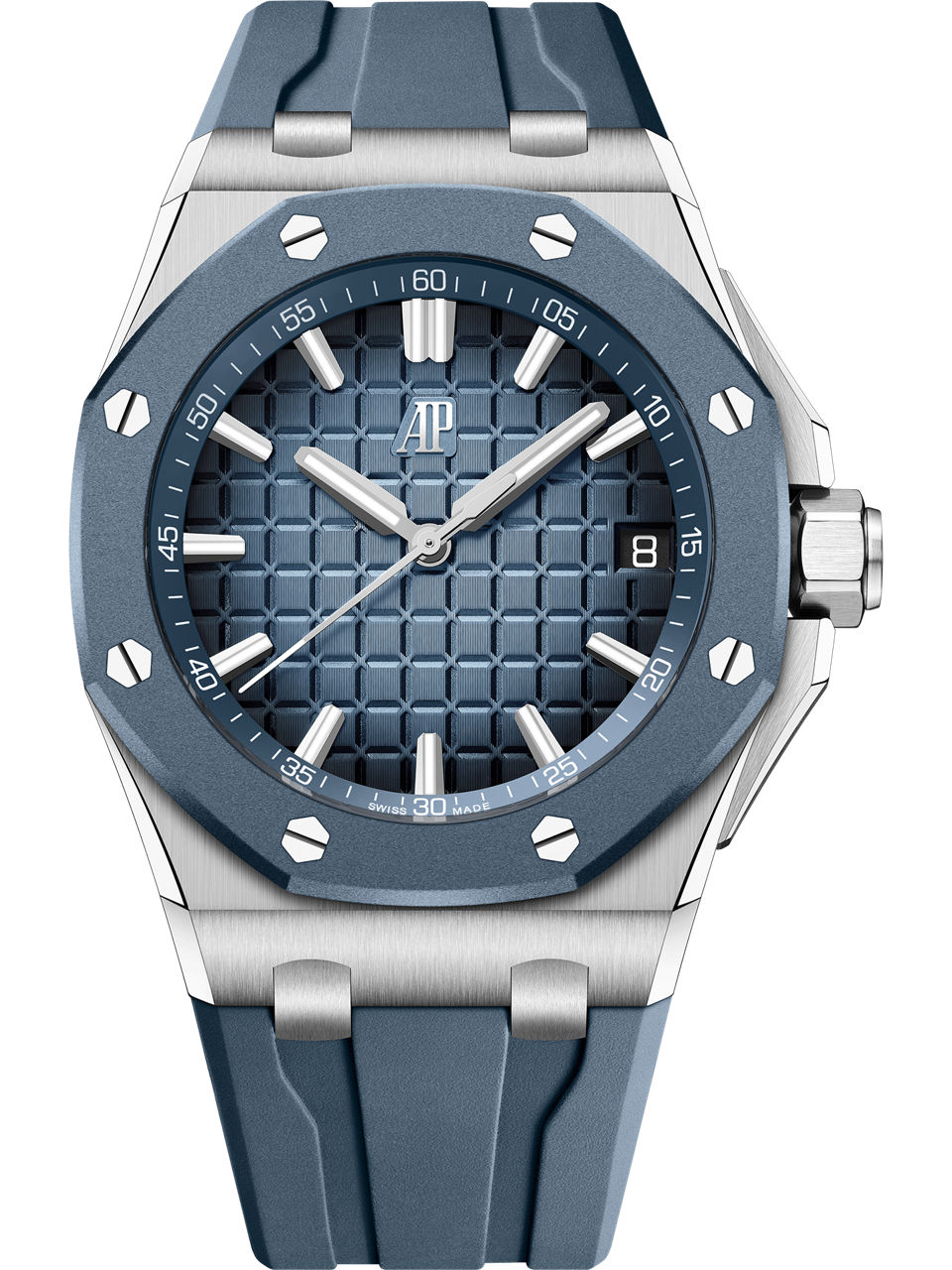 Smoked blue dial with “Méga Tapisserie” pattern, white gold hour-markers and Royal Oak hands with luminescent coating, blue inner bezel.