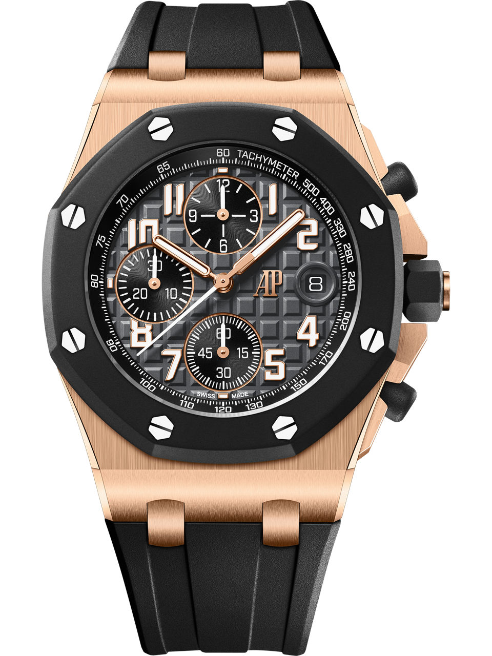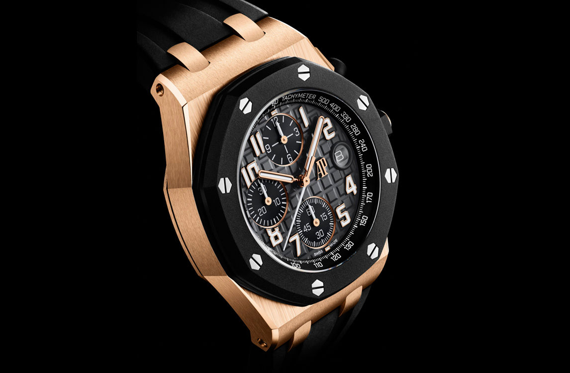 The new 42 mm Royal Oak Offshore iteration contrasts an 18-carat pink gold case with a black rubber bezel, a black "Méga Tapisserie" dial and a black interchangeable rubber strap for a sporty and elegant look.