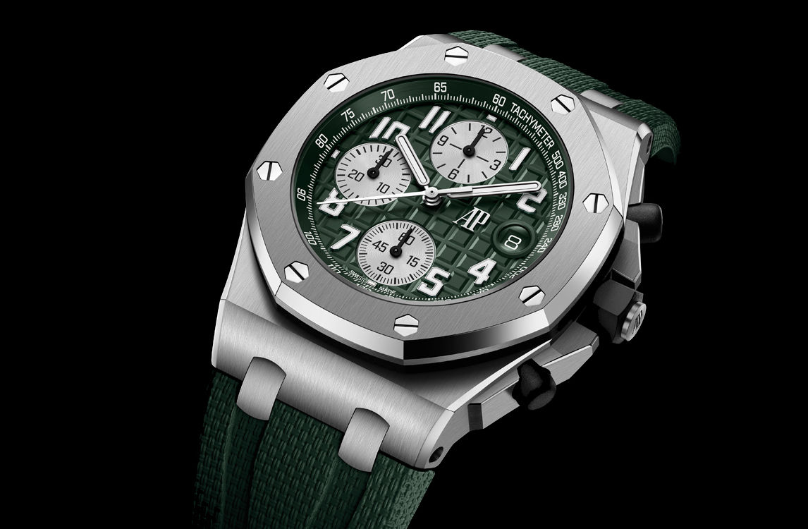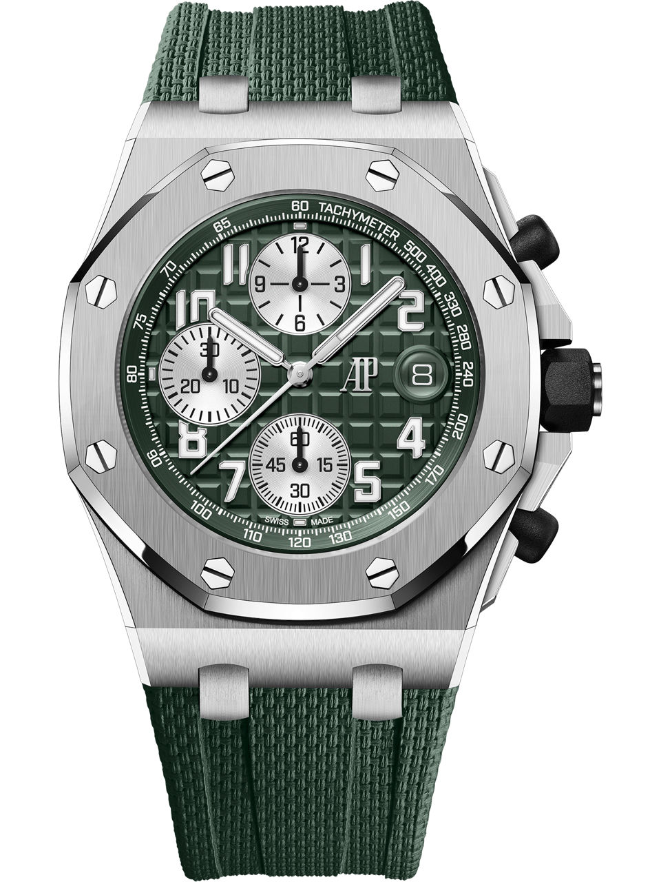 Khaki green dial with “Mega Tapisserie” pattern, silver-toned counters, arabic numerals hour-markers and white gold Royal Oak hands with luminescent coating, khaki green inner bezel.
