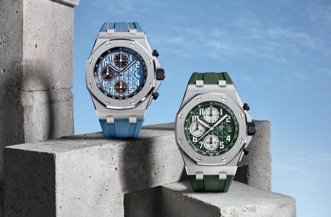 This two-tone Royal Oak Offshore unites a titanium case, a khaki "Méga Tapisserie" dial with silver-toned counters and a khaki interchangeable textured rubber strap. It is powered by the latest flyback chronograph, Calibre 4404.