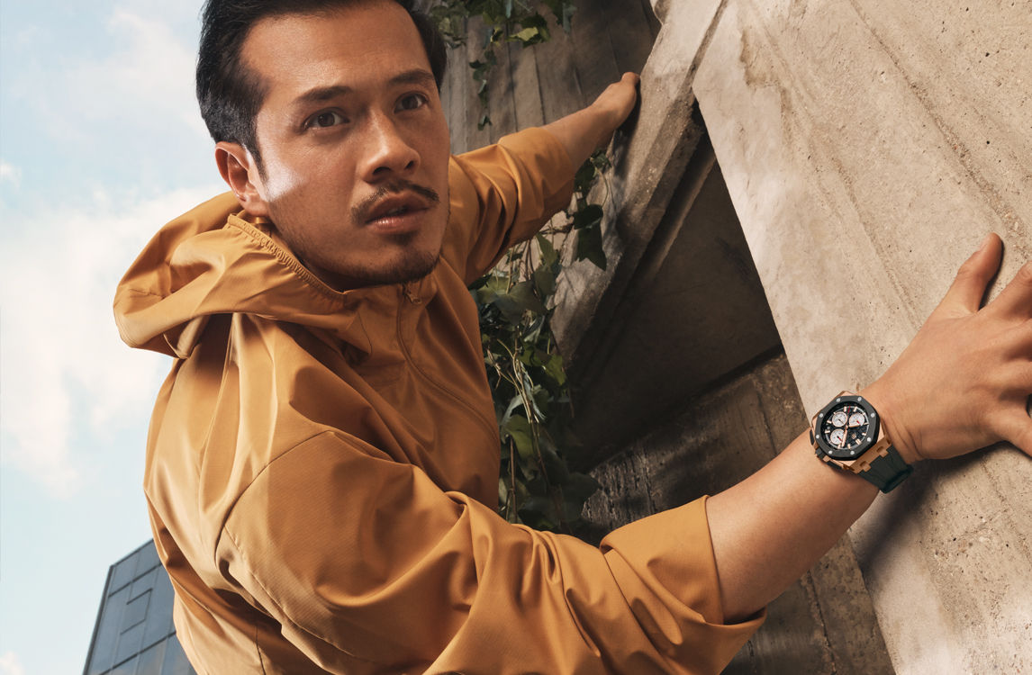 Black rubber strap with 18-carat pink gold AP pin buckle and interchangeable strap system. additional black alligator strap