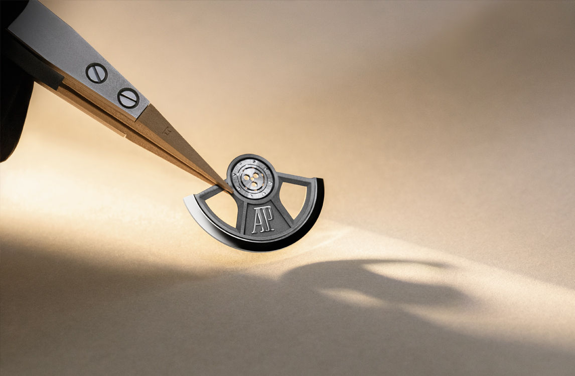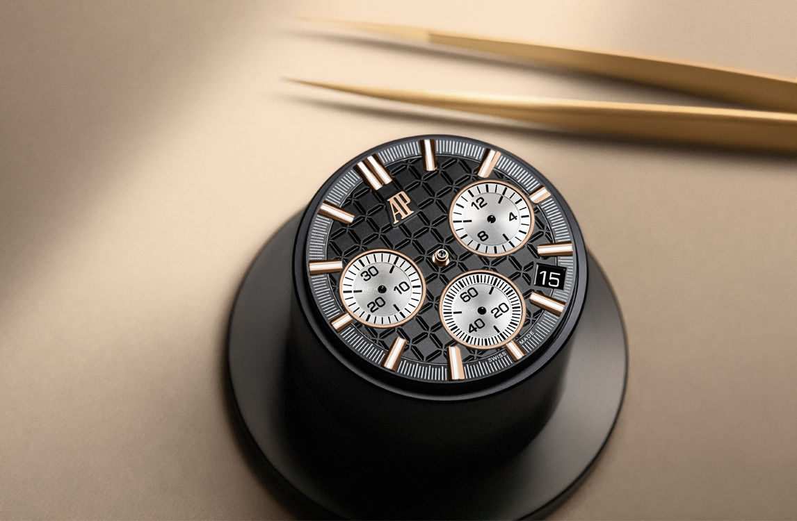 Black dial with “Méga Tapisserie” pattern, rhodium-toned counters and external zone, pink gold applied hour-markers and Royal Oak hands with luminescent coating, black inner bezel