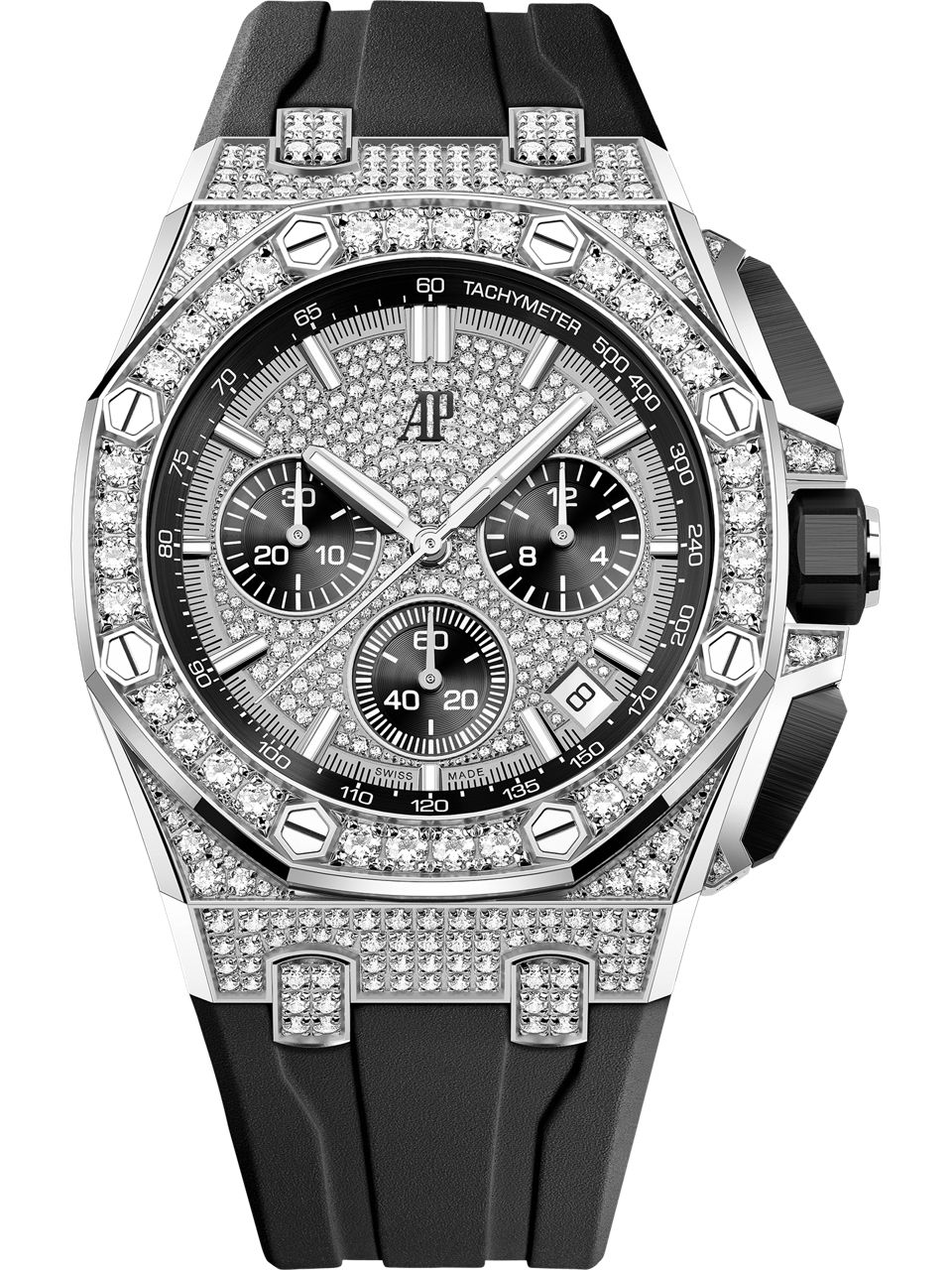 18-carat white gold dial set with brilliant-cut diamonds, black counters, white gold hour-markers and Royal Oak hands with luminescent coating, black inner bezel.