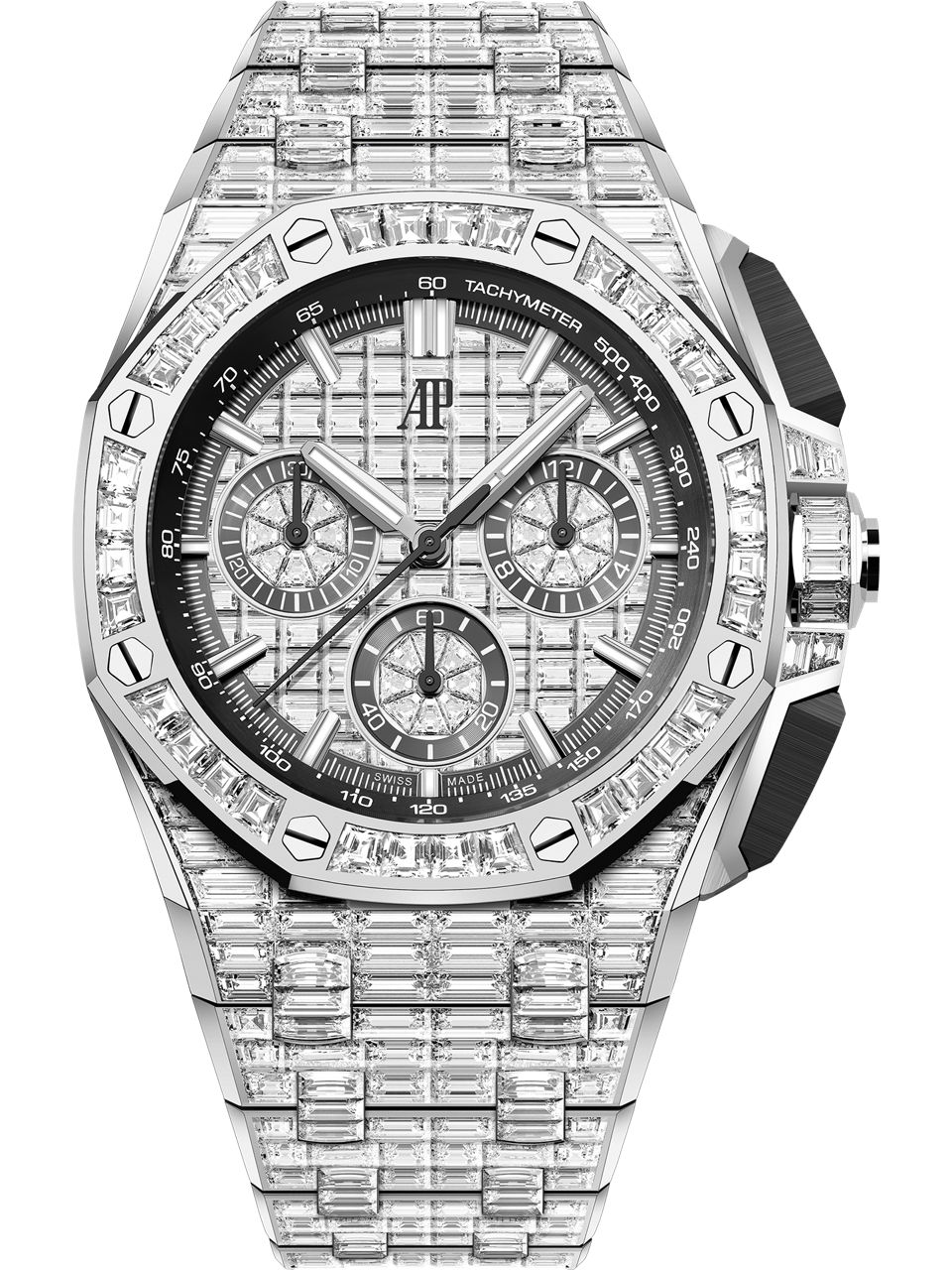 18-carat white gold dial set with baguette-cut diamonds, counters set with baguette-cut diamonds, white gold applied hour-markers and Royal Oak hands with luminescent coating, black inner bezel.