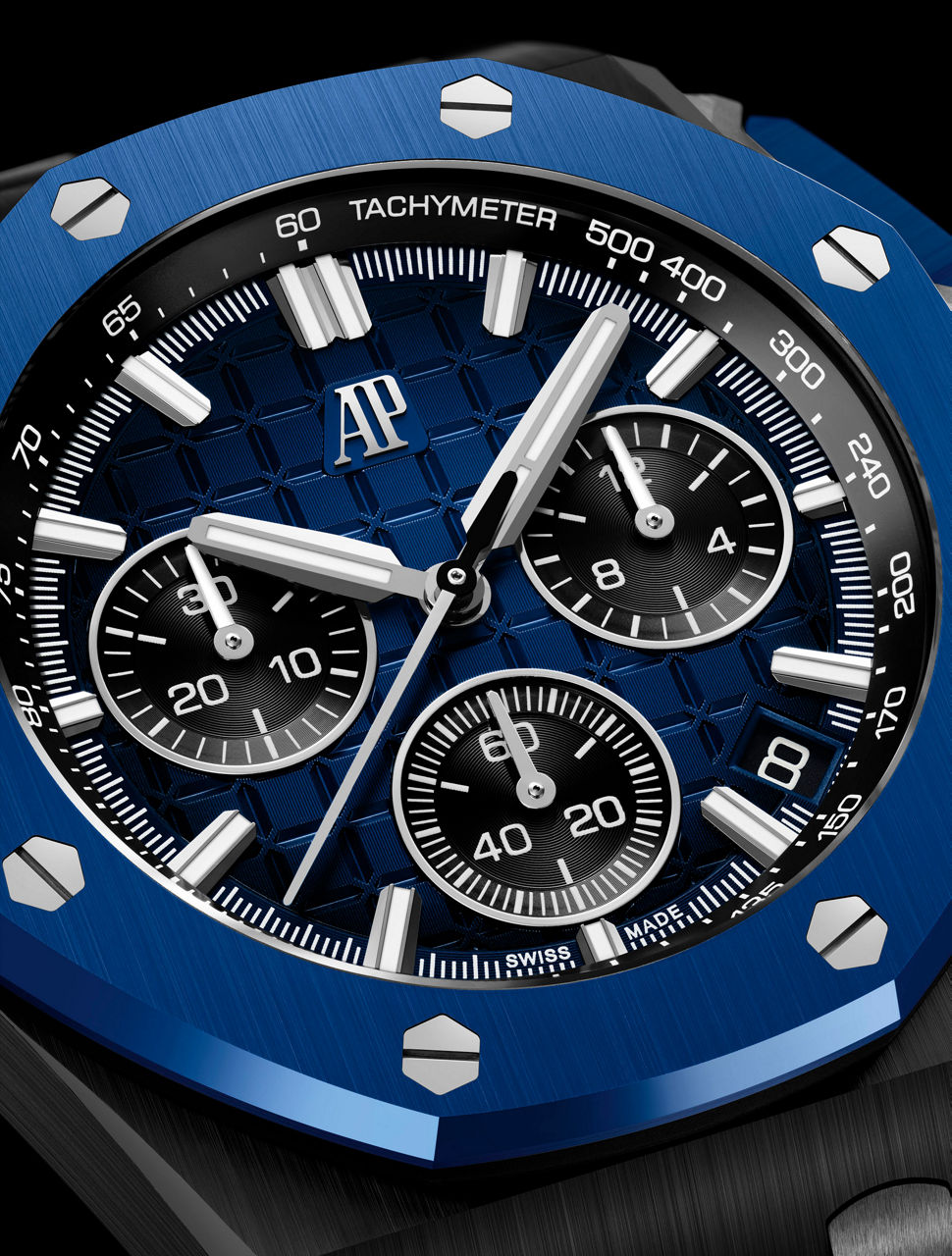 Smoked blue dial with “Méga Tapisserie” pattern, black counters and external zone, white gold applied hour-markers and Royal Oak hands with luminescent coating, black inner bezel.