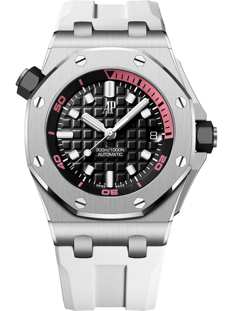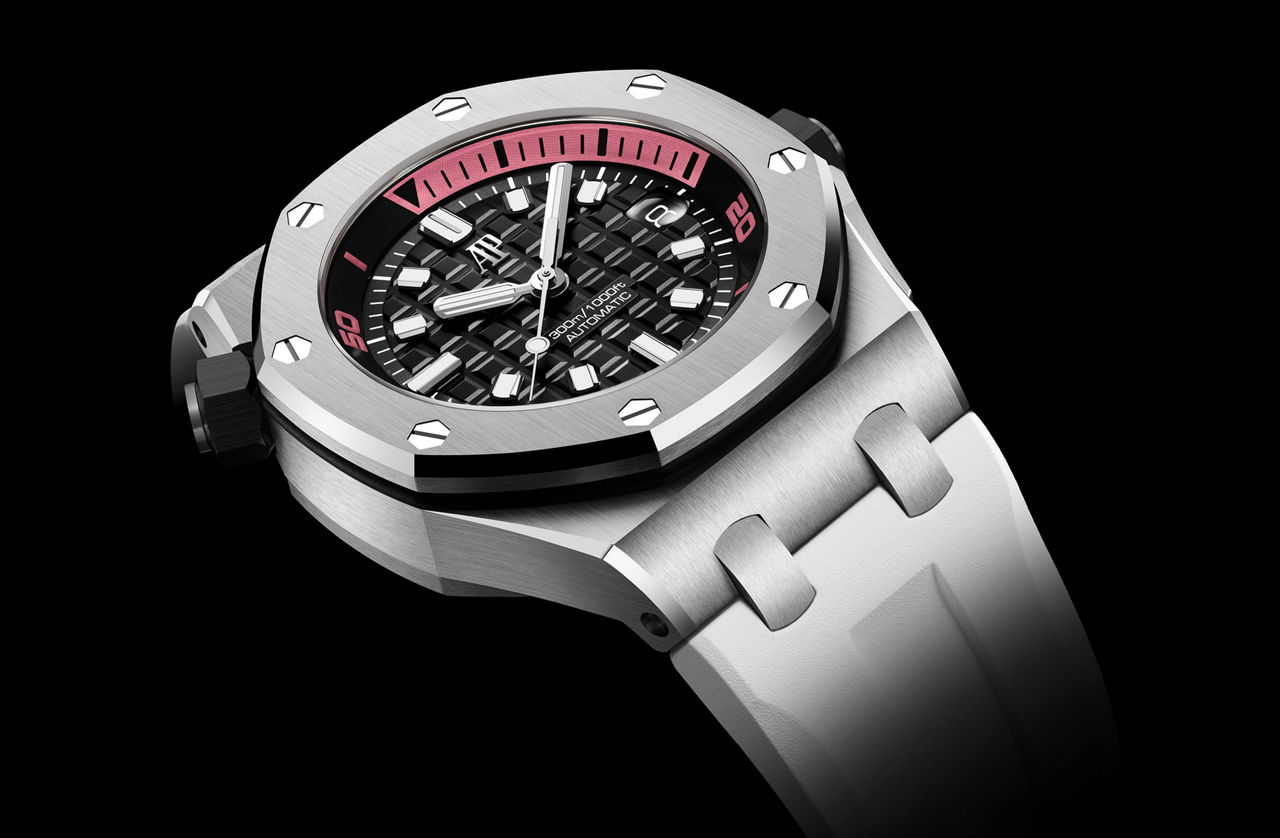 The black Méga Tapisserie dial is complemented by a pink 15-minute zone on the diving scale, 18-carat white gold hands and hour-markers filled with luminescent material and a black inner bezel.