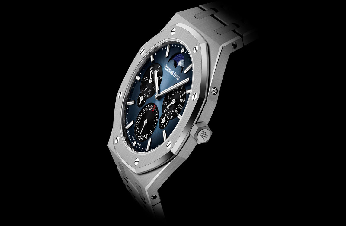 This new iteration of the ultra-thin Royal Oak Selfwinding Perpetual Calendar model marries a titanium case with a smoked blue dial and a high-flying astrological complication.