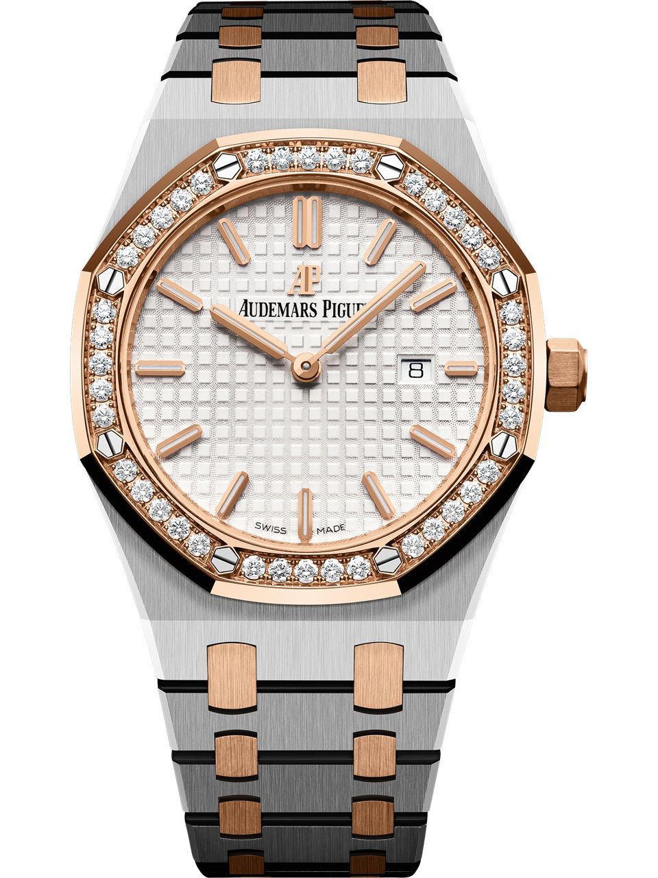Silver-toned dial with “Grande Tapisserie” pattern, pink gold applied hourmarkers and Royal Oak hands with luminescent coating.