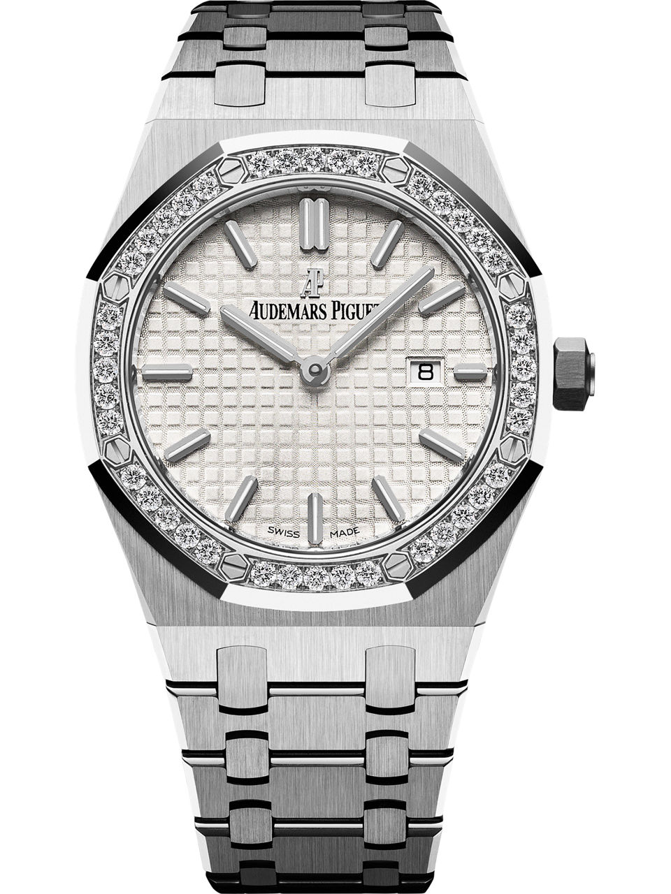 Silver-toned dial with “Grande Tapisserie” pattern, white gold applied hour-markers and Royal Oak hands with luminescent coating