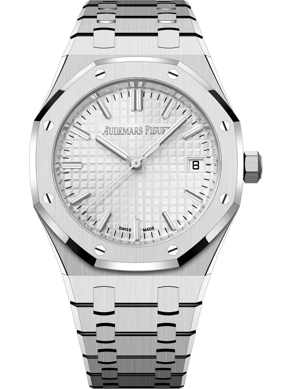 Silver-toned dial with “Grande Tapisserie” pattern, white gold applied hour-markers and Royal Oak hands with luminescent coating.