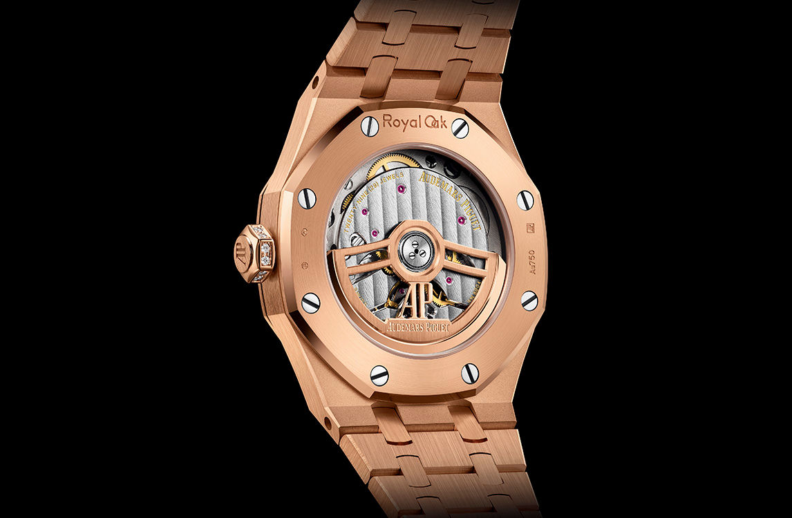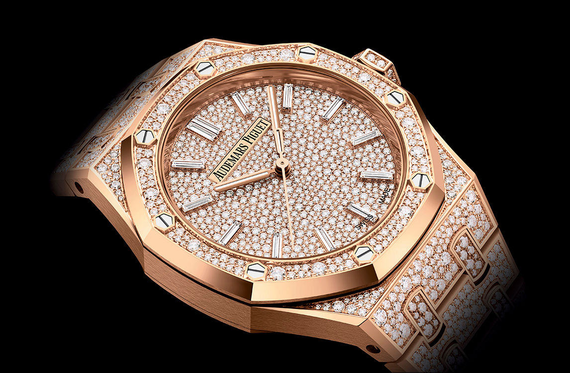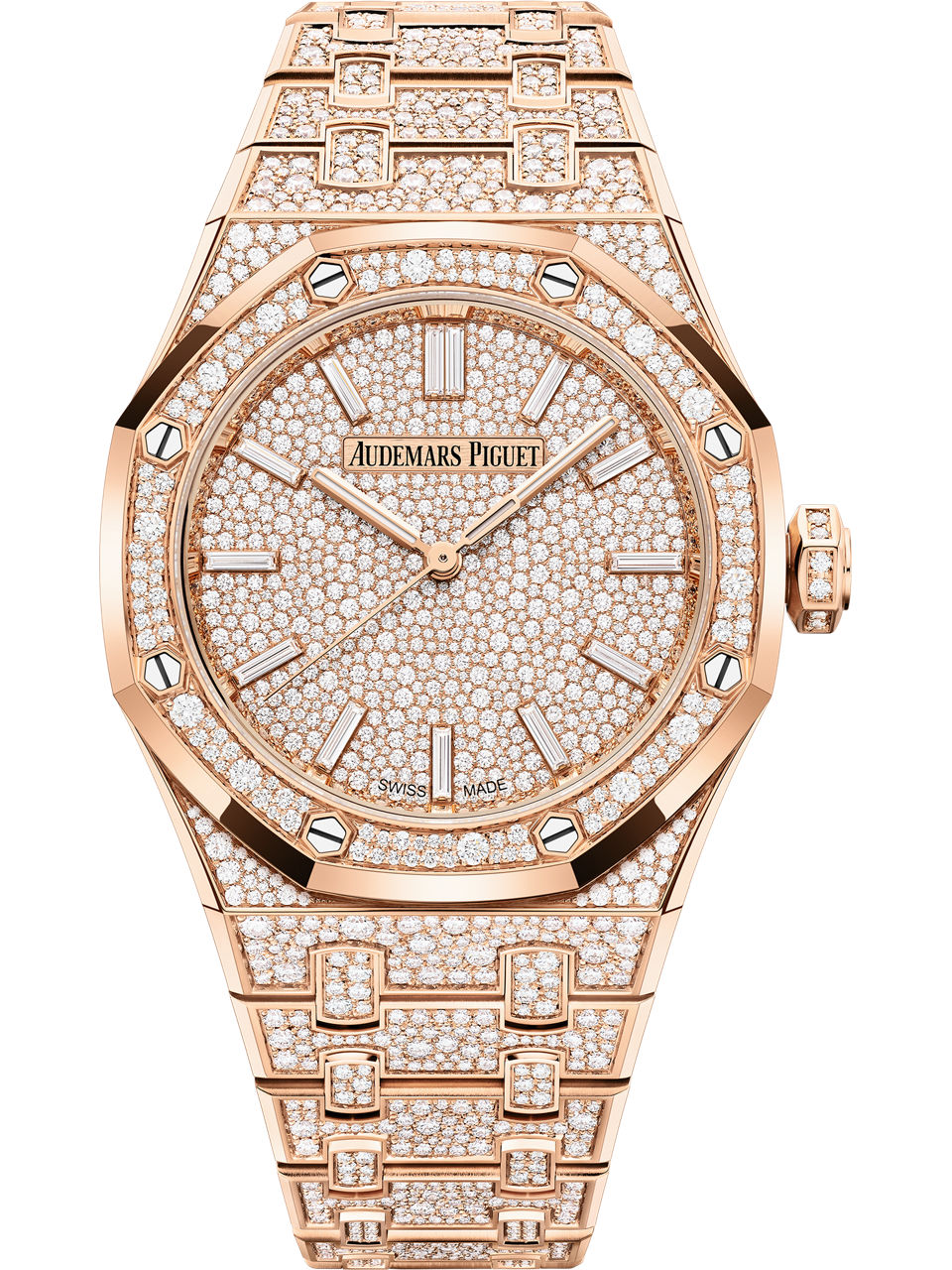 18-carat pink gold dial snow-set with brilliant-cut diamonds, baguette-cut diamond hour-markers, pink gold Royal Oak hands with luminescent coating.