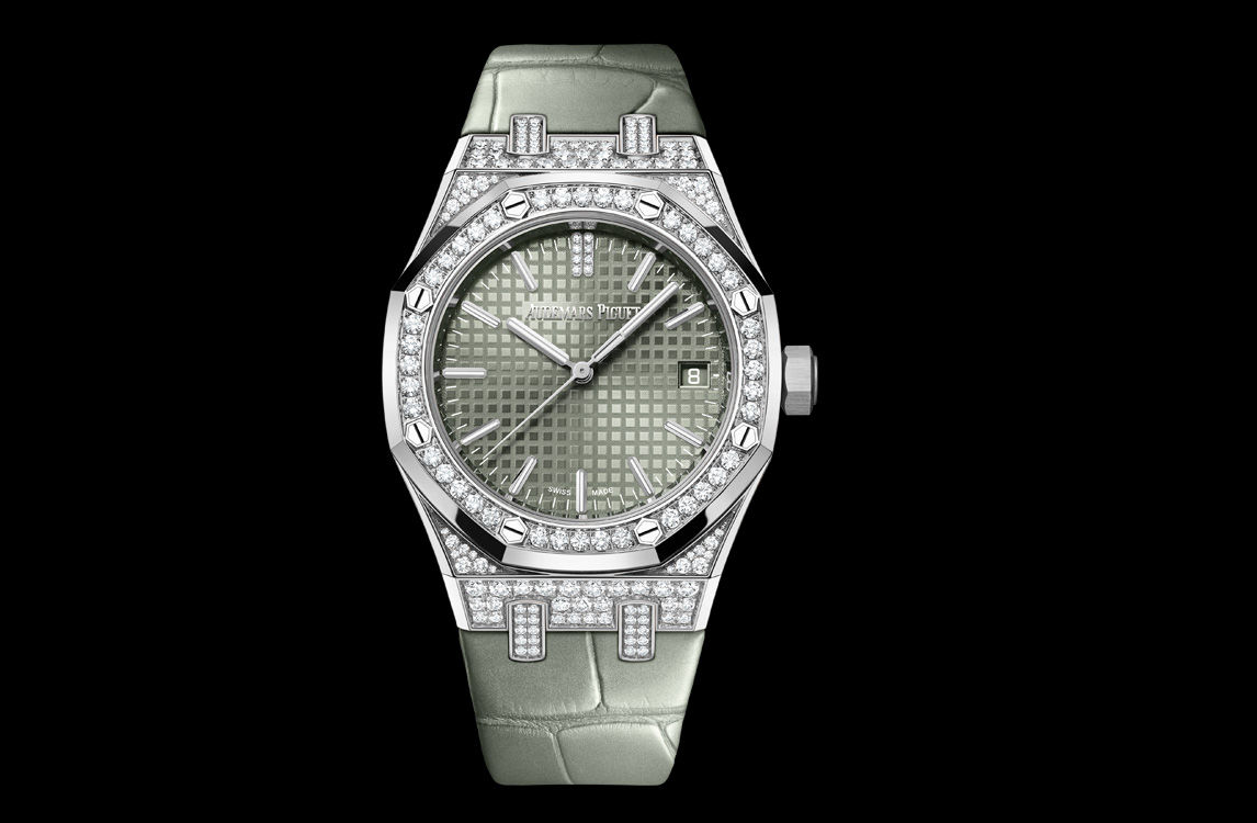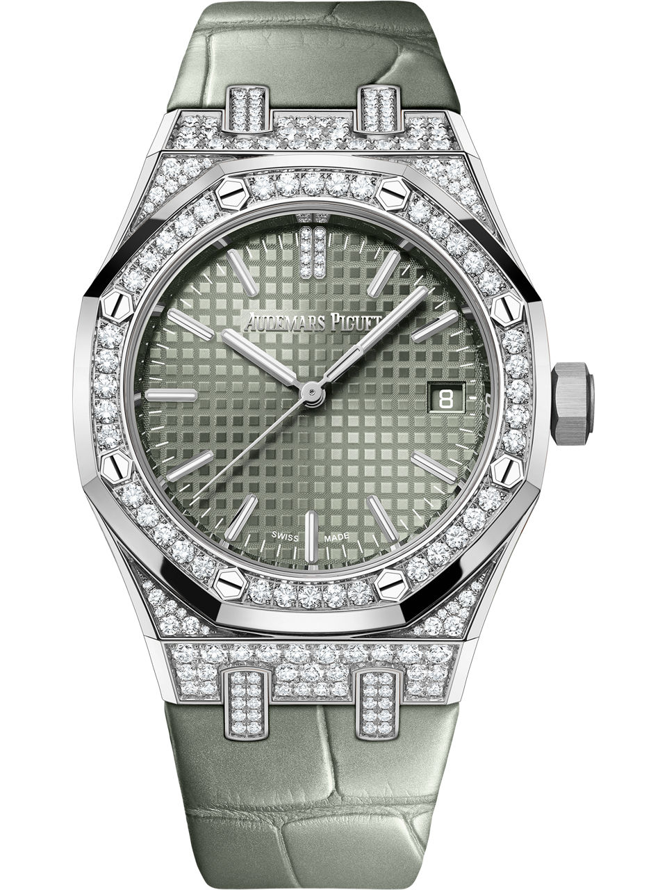 Green dial with “Grande Tapisserie” pattern, white gold applied hour-markers and Royal Oak hands with luminescent coating.