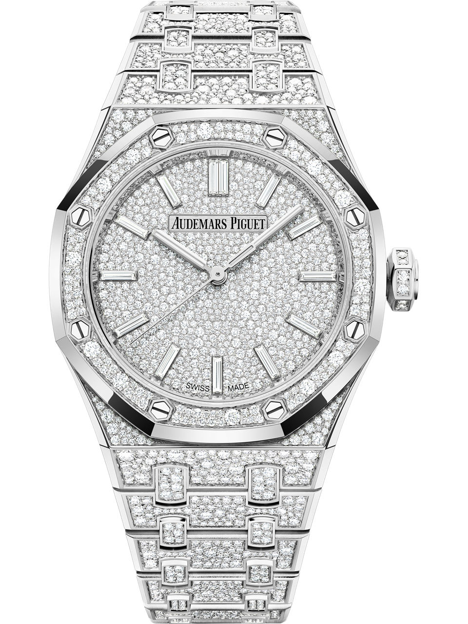 18-carat white gold dial snow-set with brilliant-cut diamonds, baguette-cut diamond hour-markers, white gold Royal Oak hands with luminescent coating.