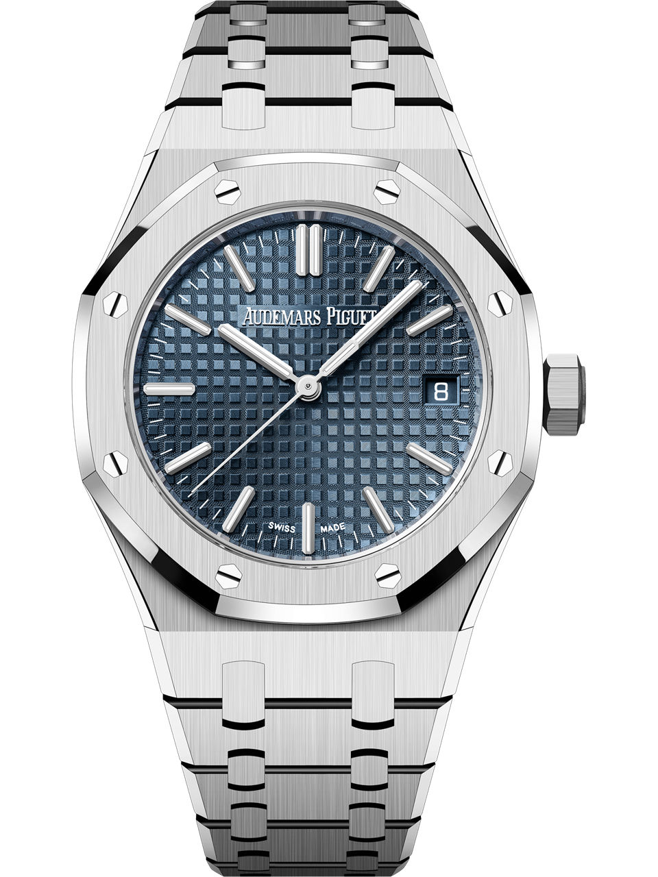 “Bleu nuit nuage 50” dial with “Grande Tapisserie” pattern, white gold applied hour-markers and Royal Oak hands with luminescent coating.