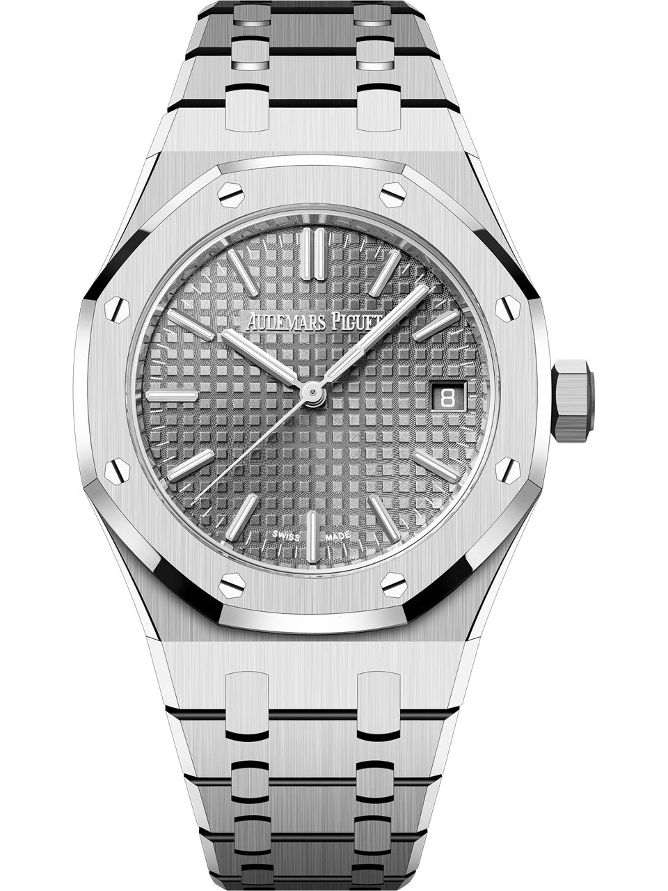 Grey dial with “Grande Tapisserie” pattern, white gold applied hour-markers and Royal Oak hands with luminescent coating.