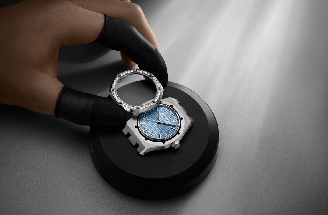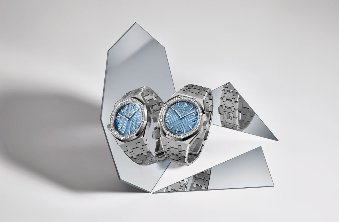 This 37 mm stainless steel timepiece encompasses the latest Royal Oak design evolution and the selfwinding Calibre 5900. The brilliant-cut diamonds decorating the bezel elegantly frame the light blue “Grande Tapisserie” dial.