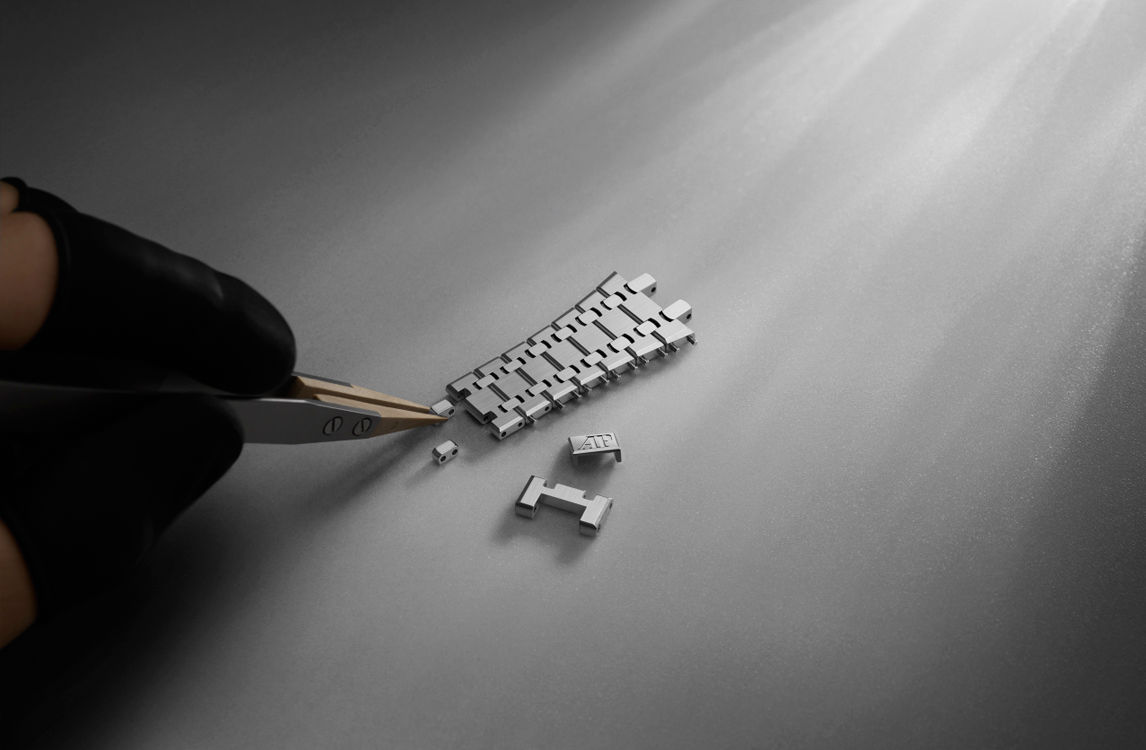 Light blue dial with “Grande Tapisserie” pattern, white gold applied hour-markers and Royal Oak hands with luminescent coating.