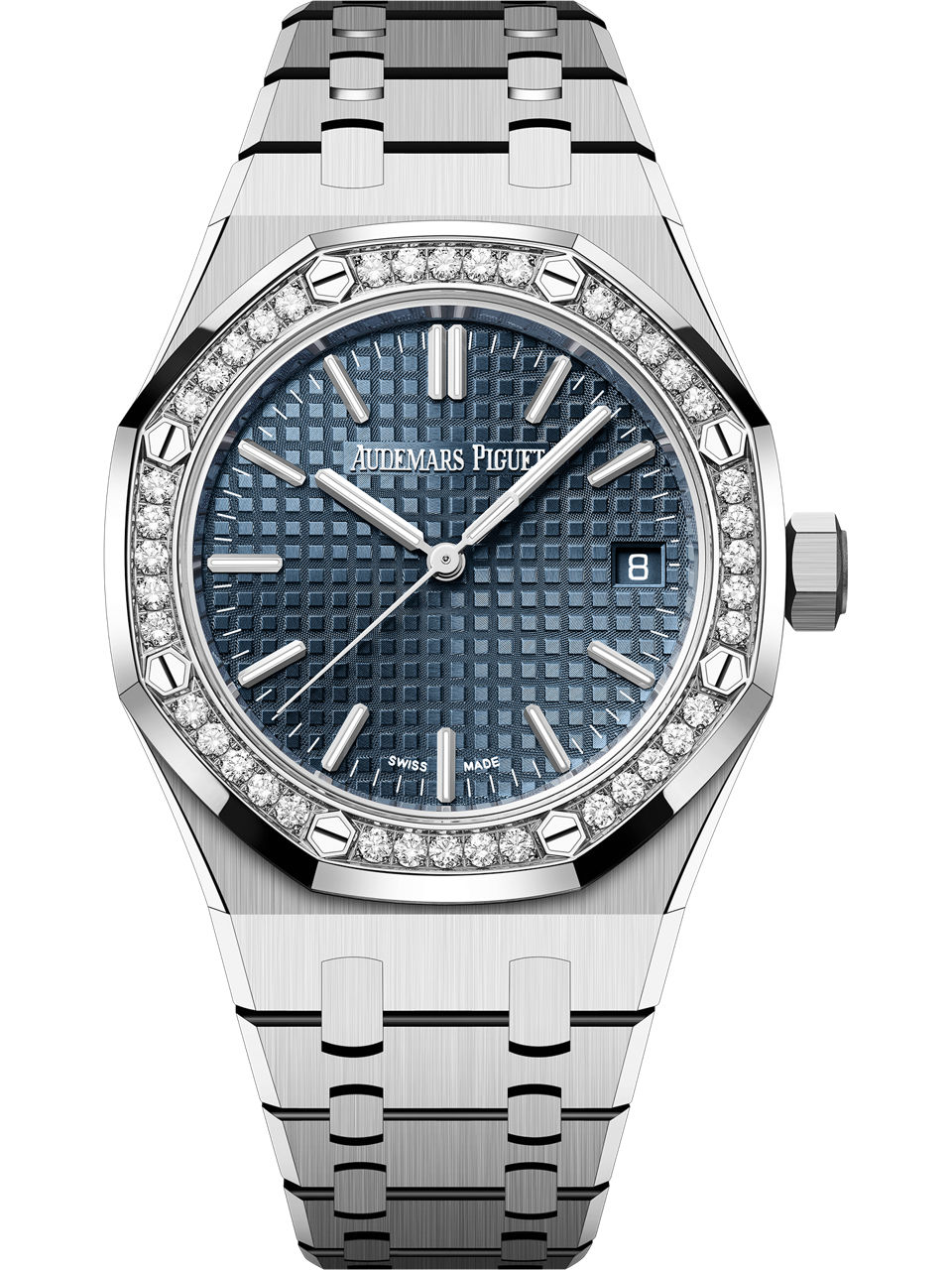 This stainless steel 37 mm timepiece is adorned with a diamond-set bezel and a "Bleu Nuit, Nuage 50" “Grande Tapisserie” dial. It is also endowed with the Royal Oak design evolution and the selfwinding Calibre 5900, both introduced in 2022.